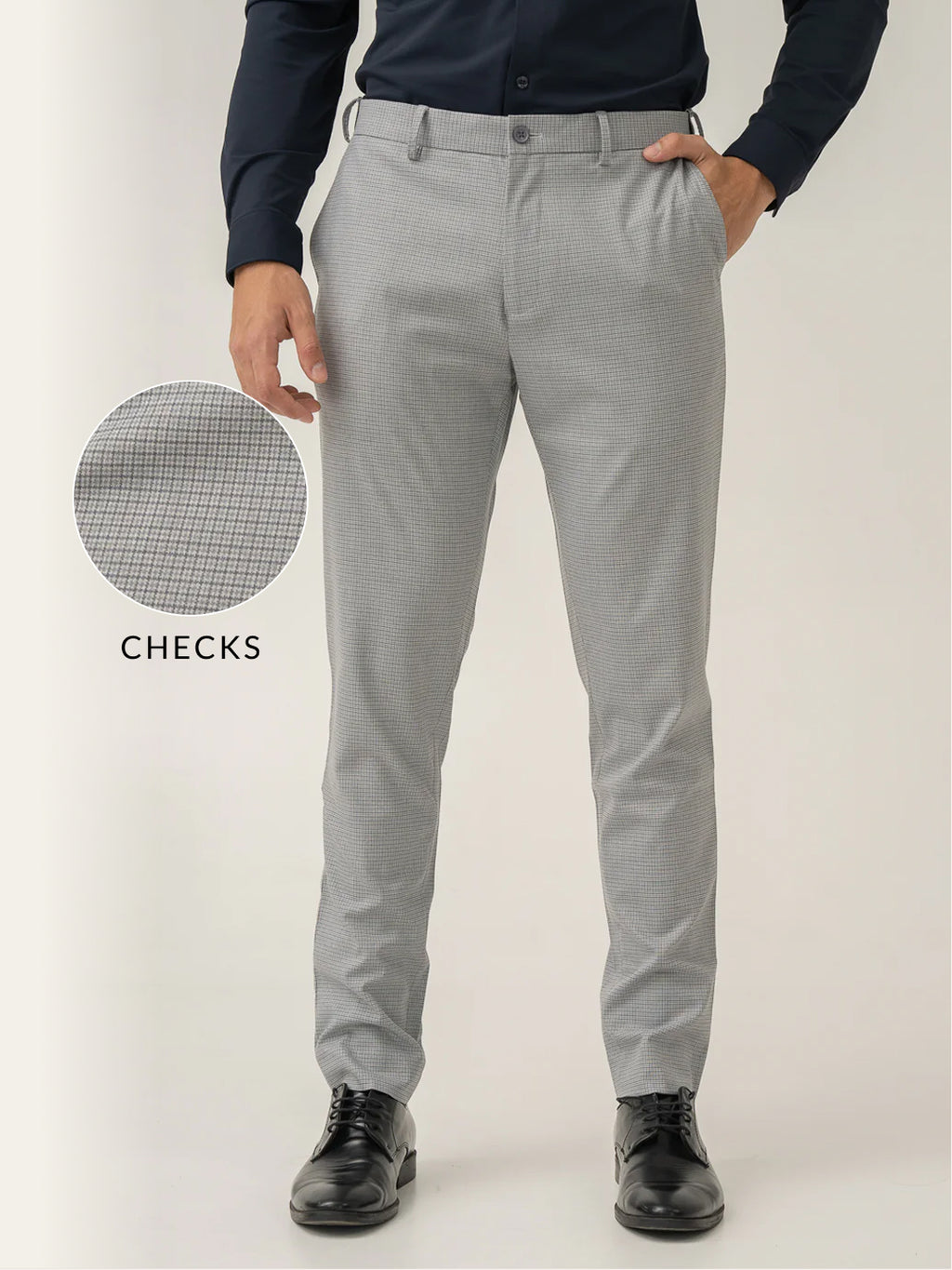 "Strong, sharp, and effortlessly stylish—the Armour Grey Micro Checks Slim Fit Stretch Formal Trousers are built for the man who means business. Crafted with 4-way stretch, a FlexTech waistband, and wrinkle-resistant fabric, these grey stretchable formal trousers move as smoothly as you do. The micro-check pattern adds a modern edge while keeping things sophisticated. Breathable, lightweight, and designed for long hours, they transition seamlessly from boardrooms to after-hours gatherings. Power dressing has never felt this comfortable.
