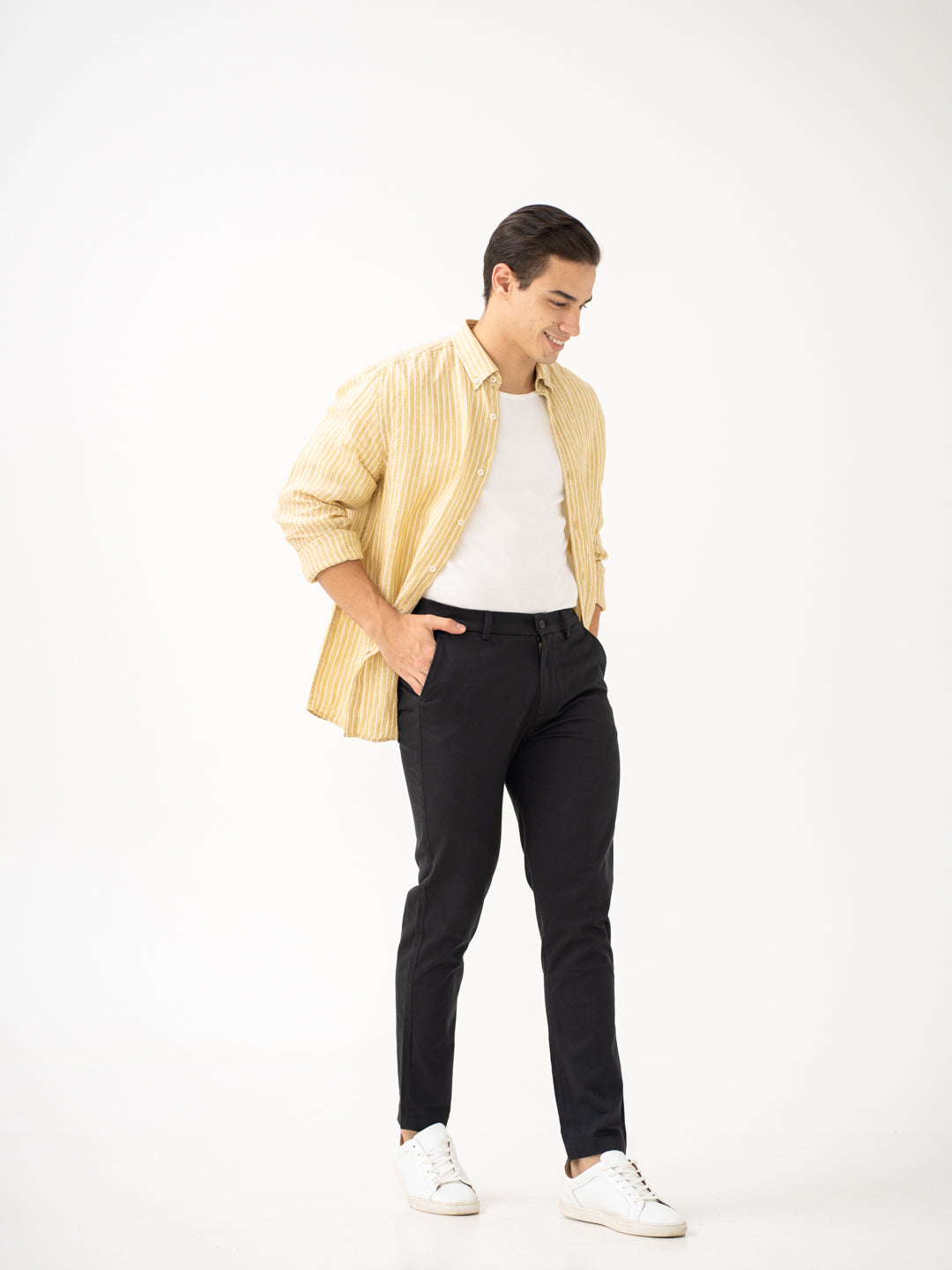 The Box Black Slim Fit Chinos are a sleek foundation for every outfit you build. Designed with breathable, high-stretch cotton and a flex-fit waistband, they keep you looking sharp through meetings, date nights, or all-day events. The classic black is effortless to style—pair with a tee, a shirt, or even a blazer. They fade naturally, developing a lived-in look that gets better with age. Comfortable enough for travel and polished enough for work, these black chinos for men are the definition of wardrobe MVP. If you need one pair that does it all—start here.