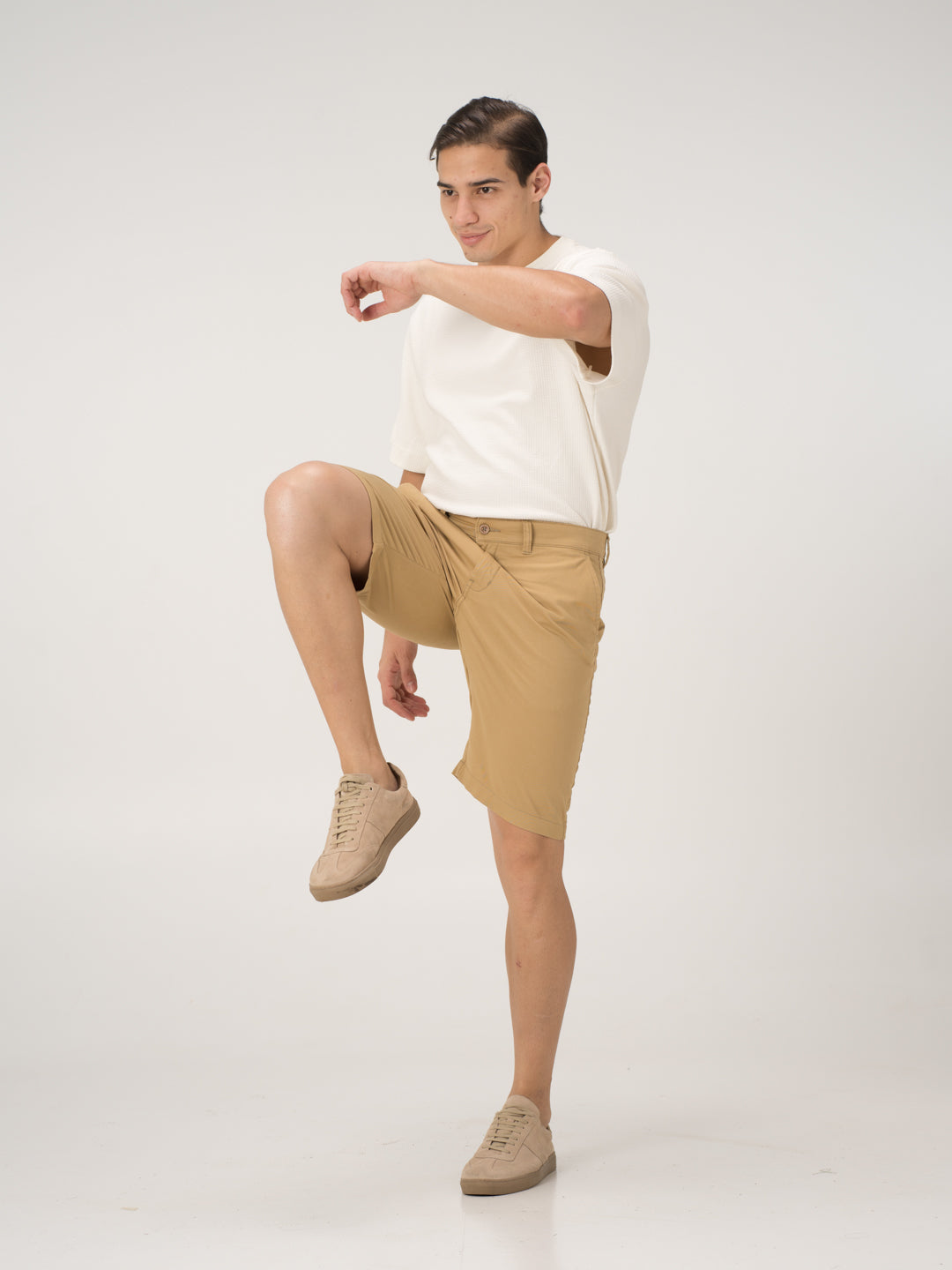 The Blonde Khaki Chino Shorts for men blend a timeless neutral with all-day comfort and effortless style. Crafted from soft organic cotton with high stretch, they offer breathability, flexibility, and ease of movement while maintaining a sharp look. The half-elasticated waistband ensures a relaxed yet secure fit, while the moisture-wicking fabric keeps you cool and fresh throughout the day. Designed for versatility, these Grey stretchable chino shorts seamlessly transition from casual daytime wear to evening outings, making them a must-have for any wardrobe.
