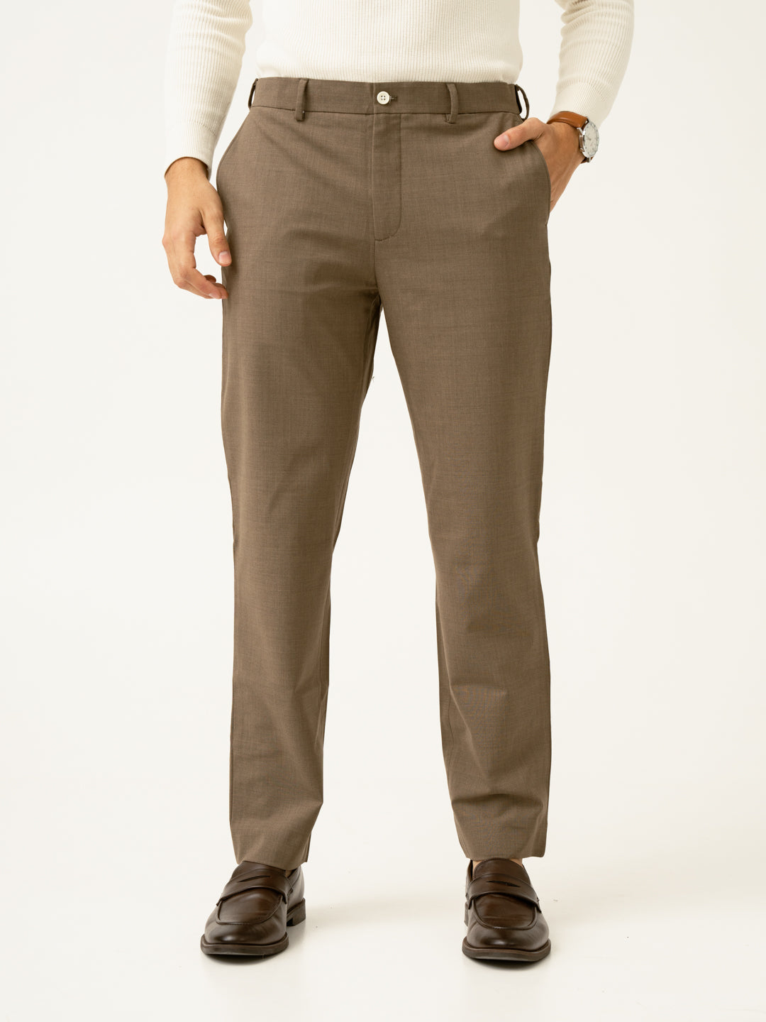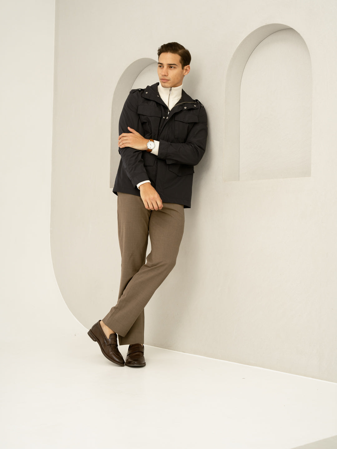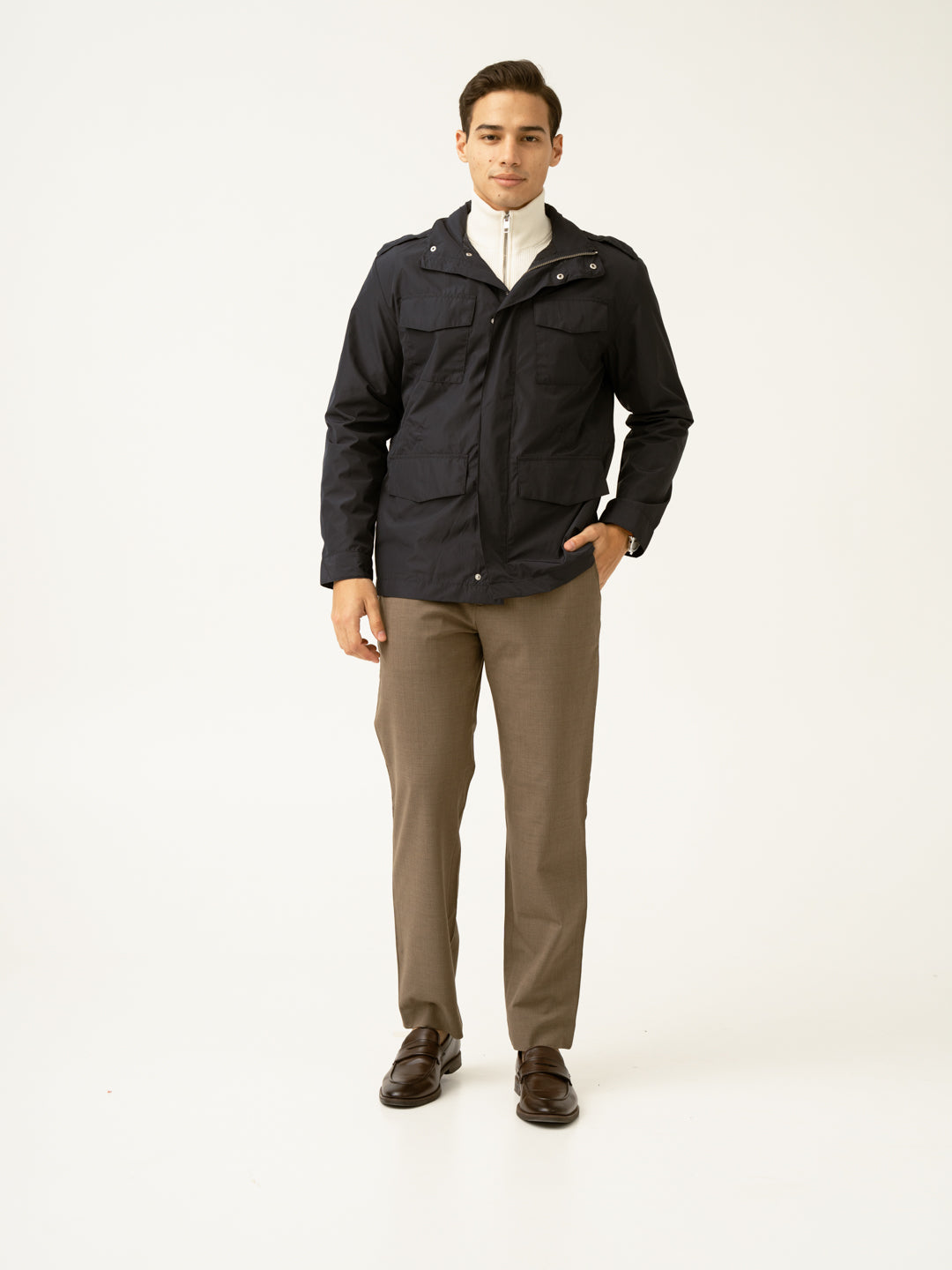 Crafted using a premium blend of, 49% Merino Wool , 46% Polyester, 5% Elastane for lightweight wear & supreme thermo-regulating comfort. Our model in the images wears a Slim Fit.