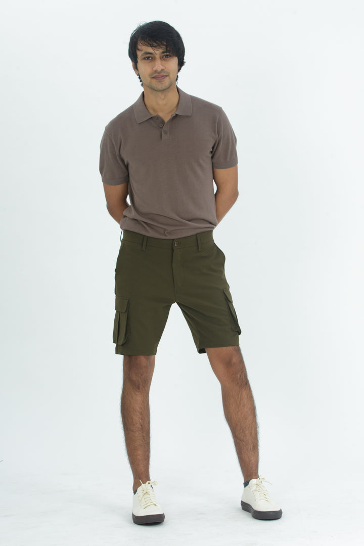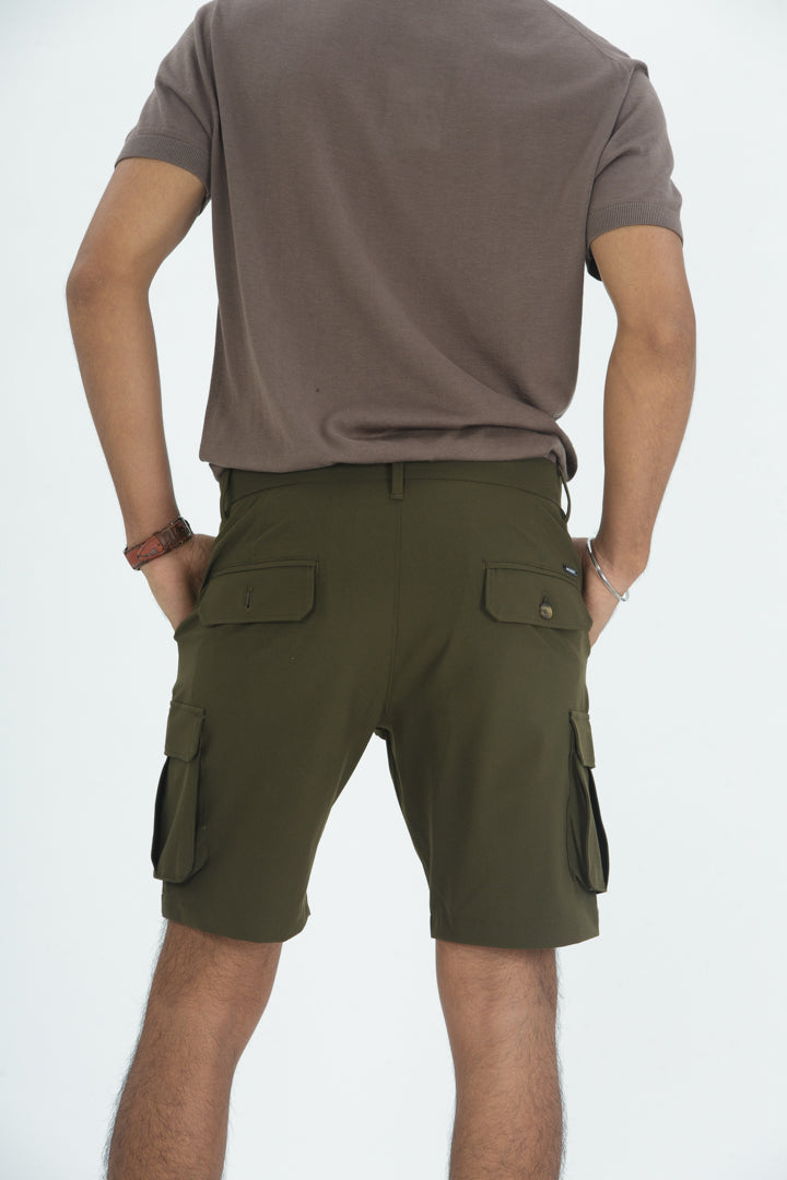 At The Pant Project, we're proud to introduce our Army Olive Stretch Cargo Shorts, designed for the modern, on-the-go lifestyle. These shorts are meticulously crafted from a blend of polyester, viscose, and elastane, providing the perfect balance of semi-casual comfort and flexibility. Our tapered fit design ensures a stylish yet comfortable fit, making these shorts a versatile addition to any wardrobe.