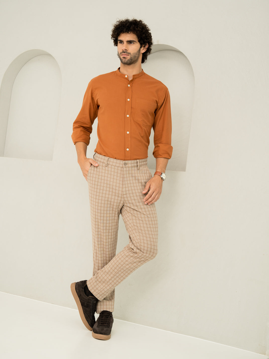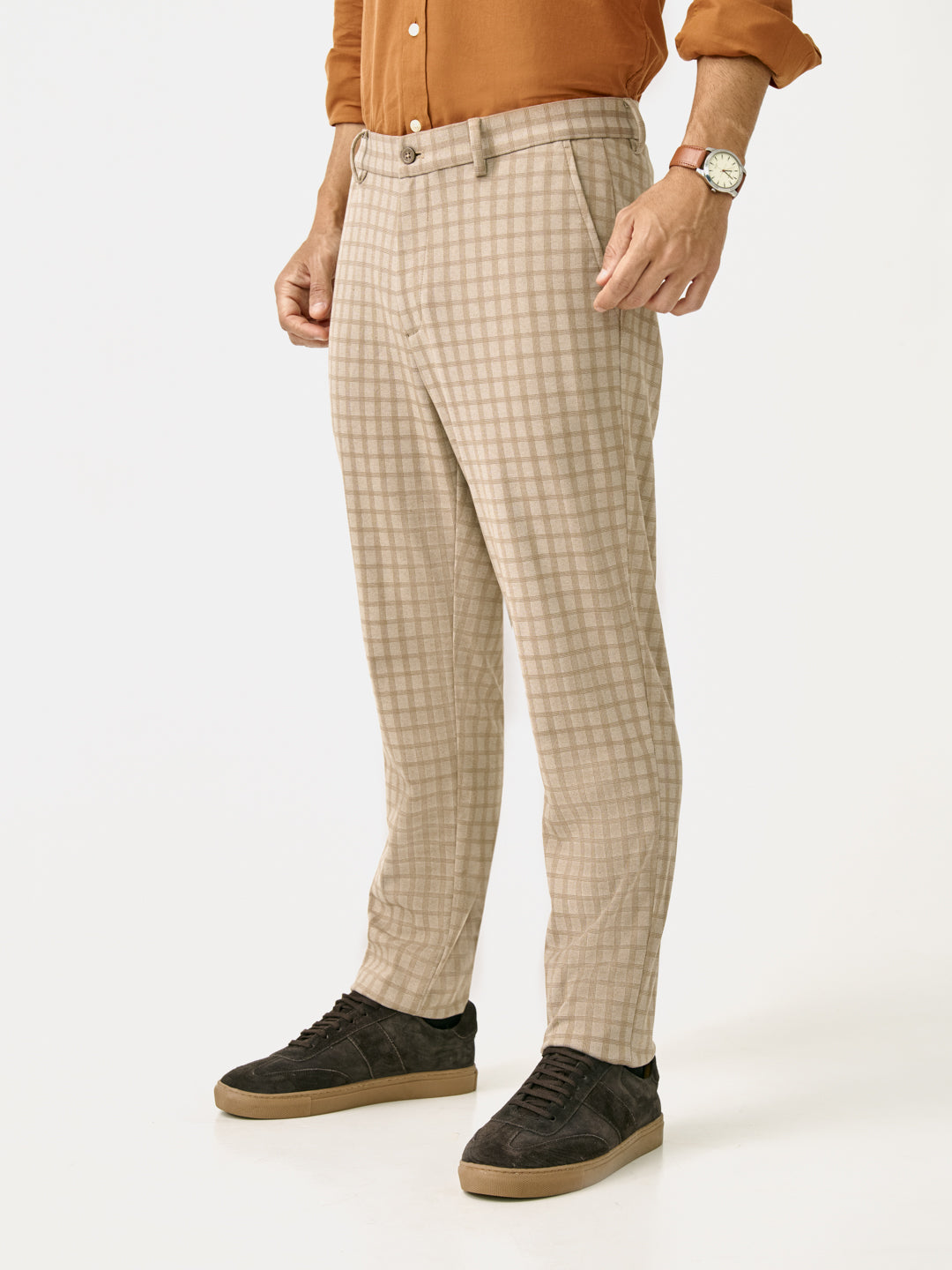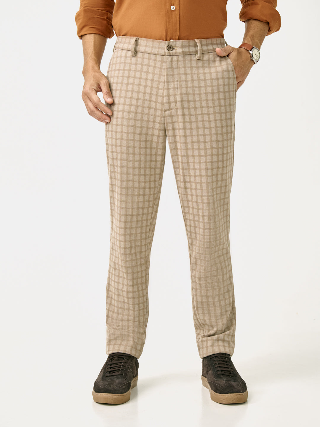 Elevate neutral tones with the Cayote Khaki Slim Fit Power-Stretch Pants. These Cayote Khaki Stretchable Trousers are crafted from a premium polyester-viscose-elastane blend for four-way stretch, wrinkle resistance, and breathable comfort. A stretchable waistband and shirt gripper ensure a polished fit from day to night. Pair these Khaki Stretchable Trousers with whites, rusts, or navy tones to create refined looks for every occasion—versatile, sharp, and always stylish.