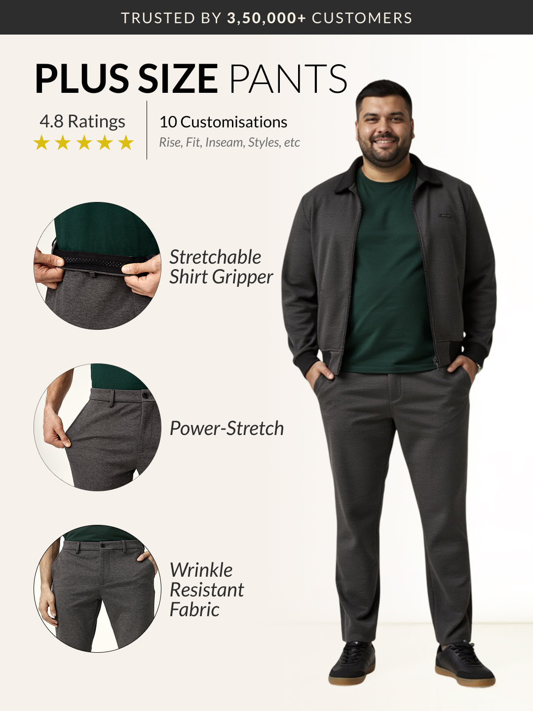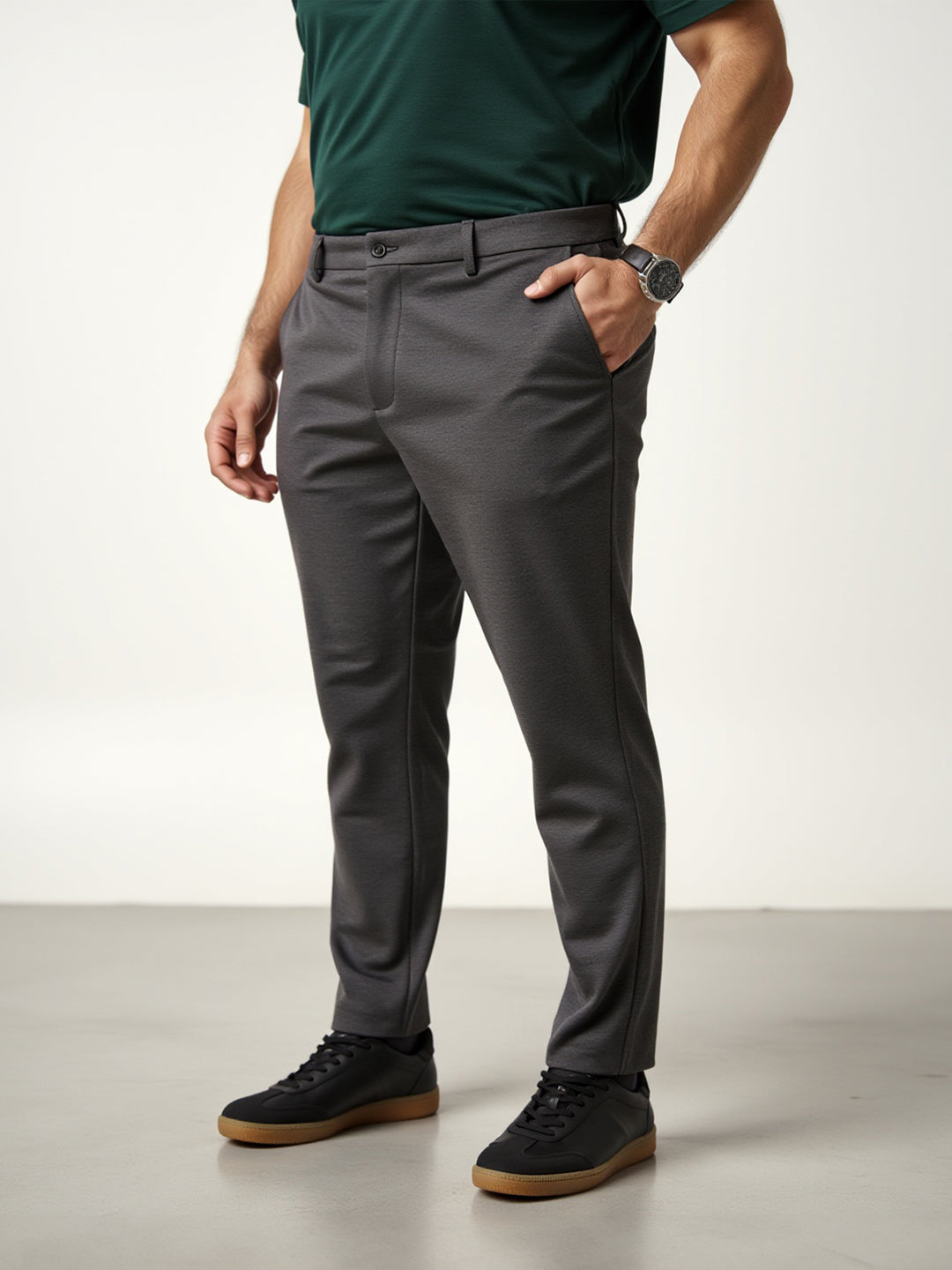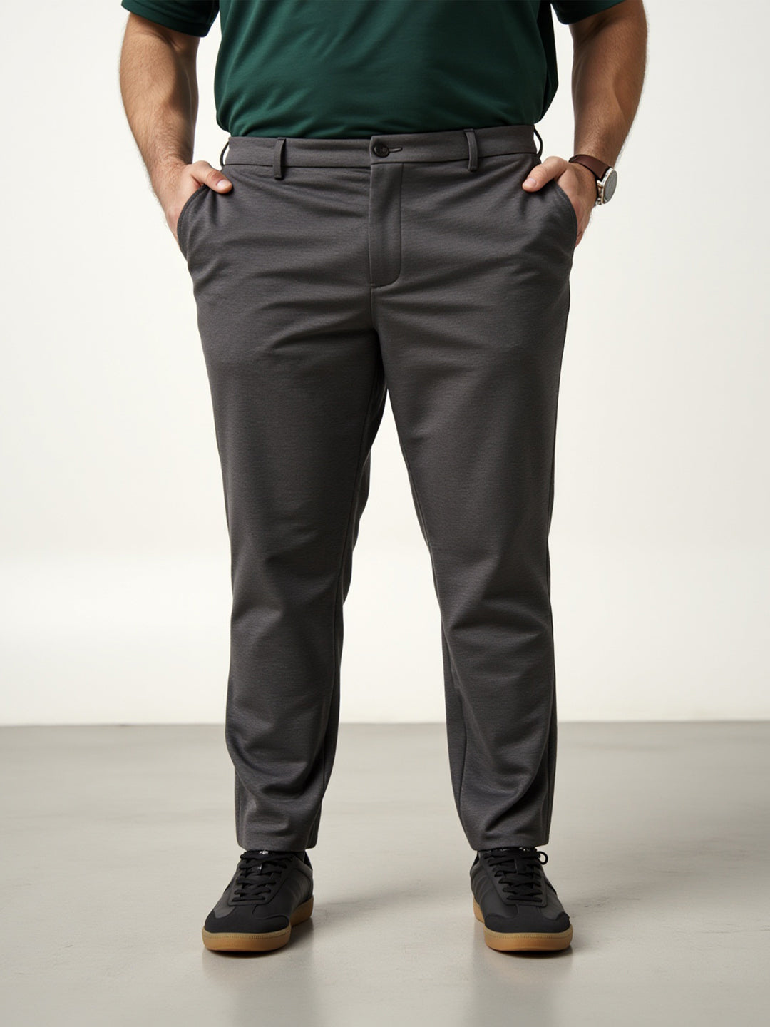 Charcoal Plus Size Power-Stretch Pants are made for days when you want comfort, but your calendar says “get it together.” These Charcoal Plus Size Stretchable Trousers For Men give you all the structure of tailored pants with the feel-good flex of your favourite joggers. Whether it’s a big meeting or last-minute plans, these everyday trousers have your back (and waist). The rich tone adds polish, while the stretch brings ease. Say hello to Men’s charcoal plus size stretchable trousers that make showing up feel like winding down.