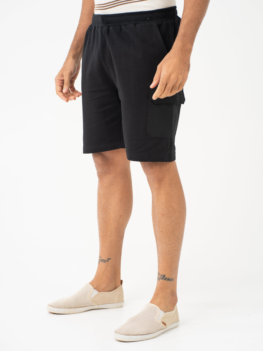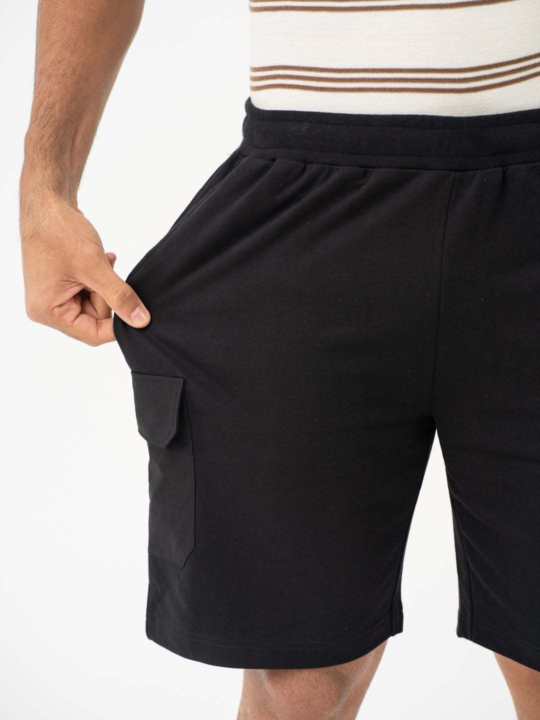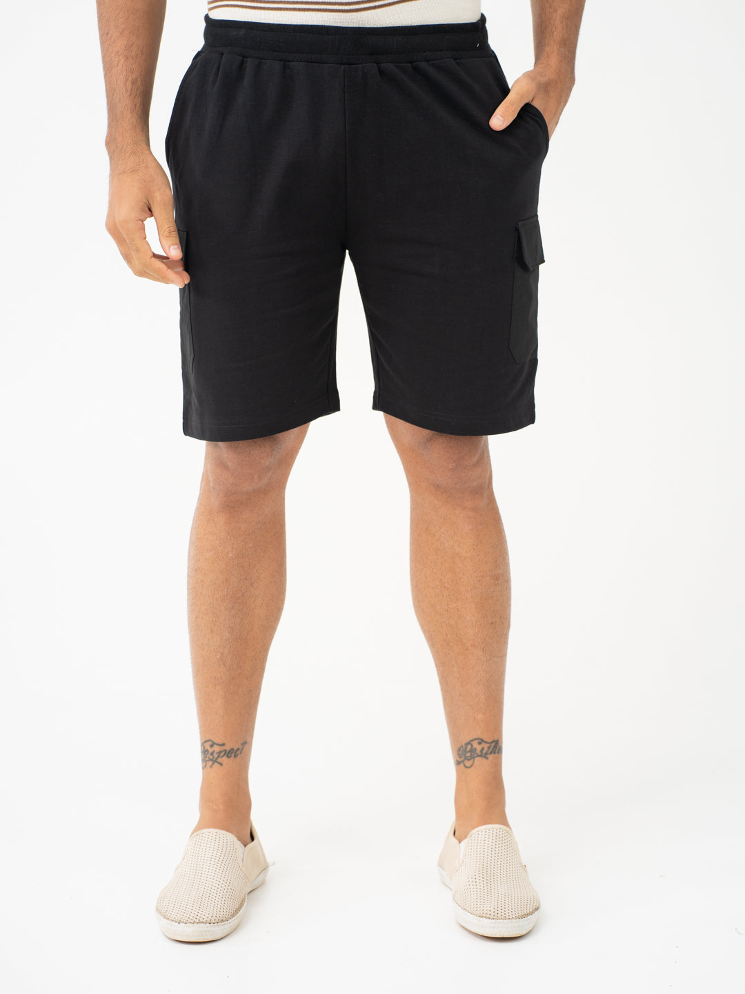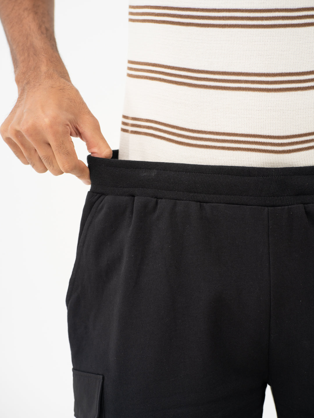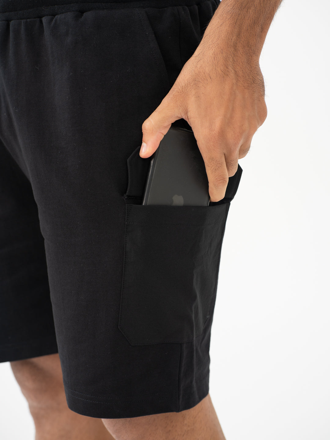 are black sweatshorts designed for everyday ease. Made from a breathable cotton blend with added stretch, these Errand Sweatshorts offer comfort and mobility for quick errands, travel days, or home lounging. Featuring six functional pockets, including durable nylon cargo styles, they balance utility with clean design. Moisture-wicking fabric keeps you fresh through the day, while an elastic waistband with drawstring gives an adjustable fit. Ideal for men seeking black cotton sweatshorts for men that are equal parts functional and comfortable, built to handle everything from casual walks to weekend plans.