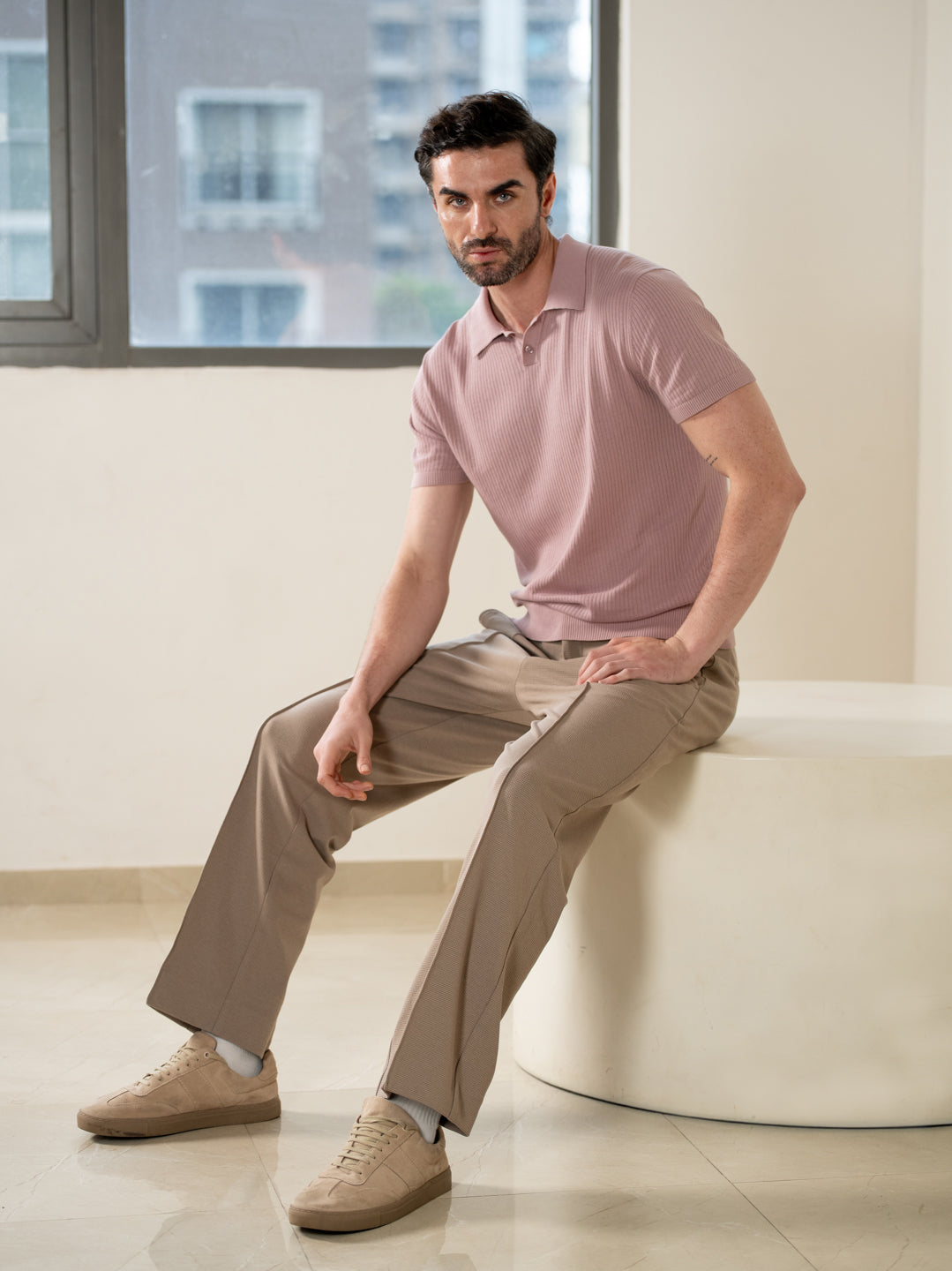 Crafted using a smart blend of 62% Polyester 34% Viscose & 4% Elastane to give you the additional soft-stretch-comfort. Our model in the image wears a Relaxed Fit.