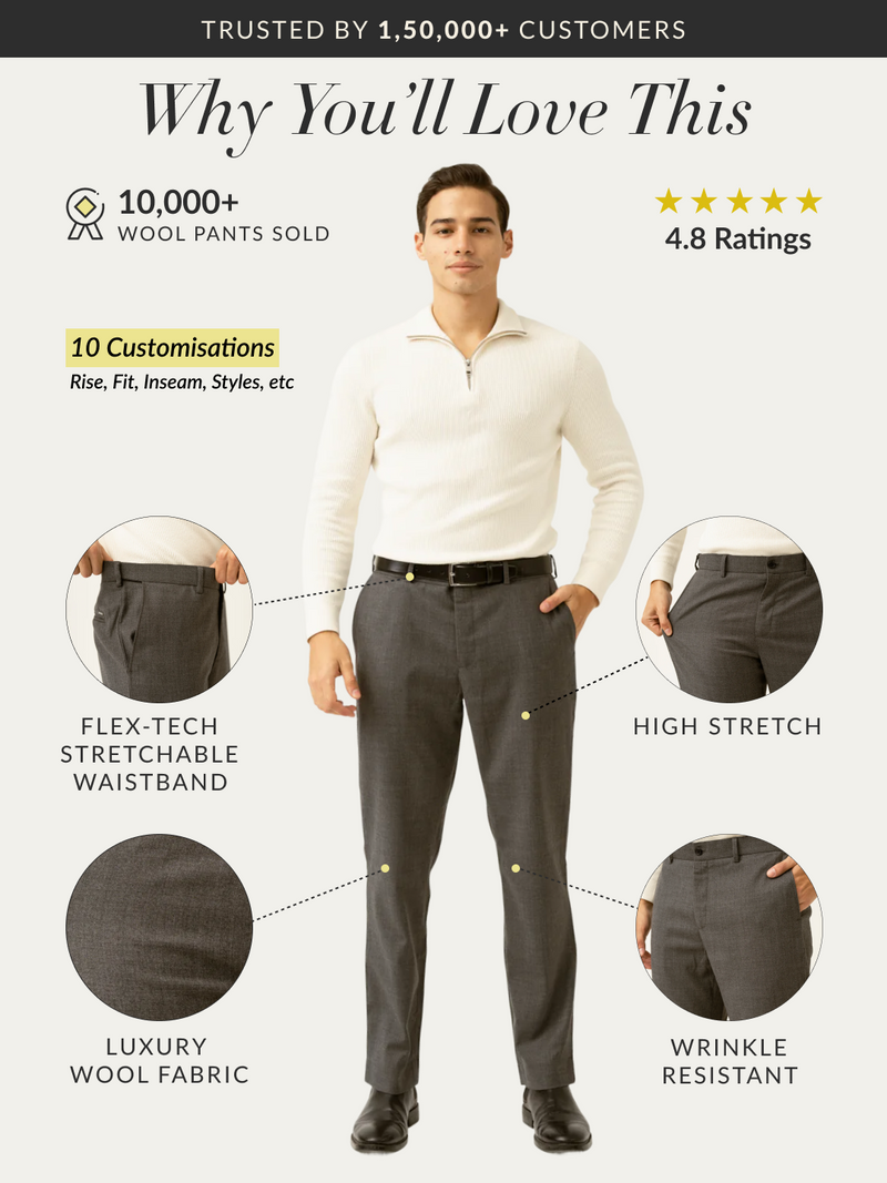 When your day takes you from early meetings to late-night plans, the Great Grey Luxury Merino Wool Pants have your back. Made from premium Australian Merino wool, they’re soft, lightweight, and built to move with you and thanks to 4-way stretch and a FlexTech waistband. Whether you’re stuck in traffic or sprinting through airports, these pants stay wrinkle-free, breathable, and comfortable. They even adjust to the weather with thermo-regulating fabric. The clean grey colour goes with just about everything, making these great grey wool pants for men your everyday go-to that feels anything but basic.