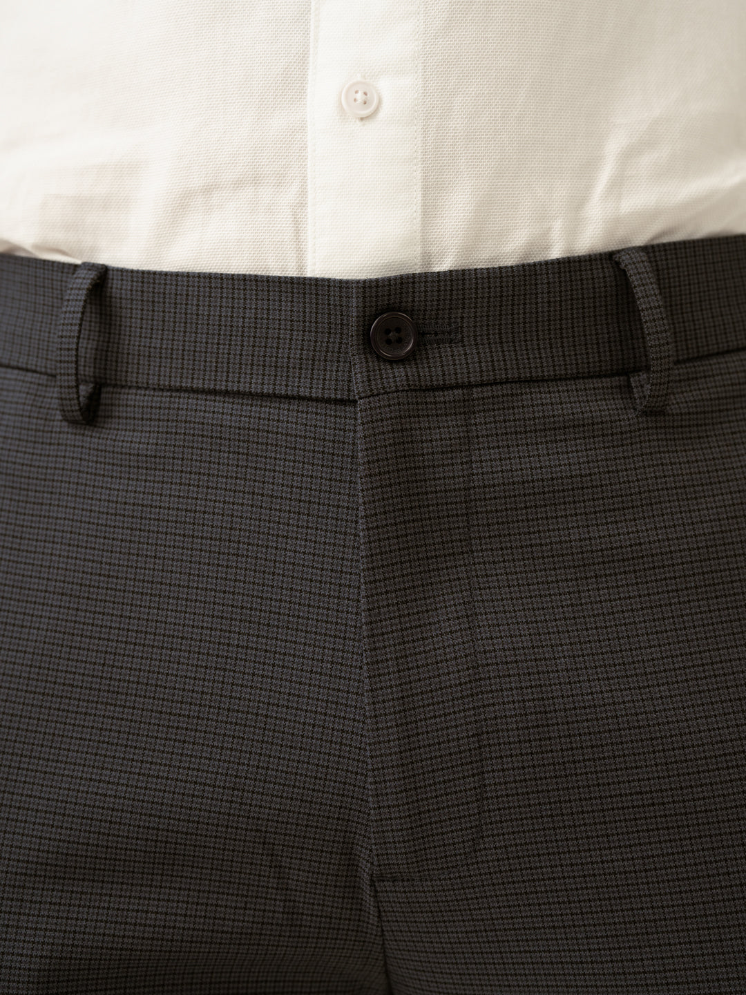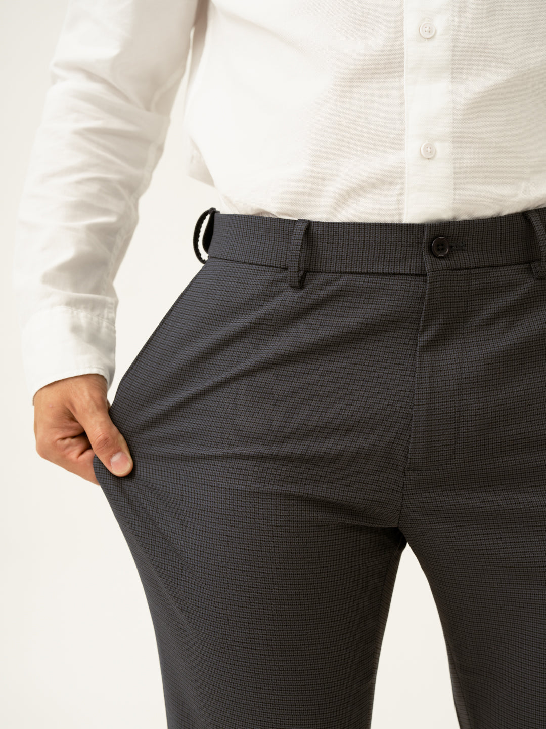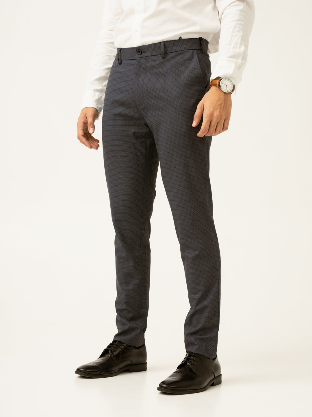 "For the man who likes understated sharpness, the Gunmetal Grey Micro Checks Slim Fit Stretch Formal Trousers are a perfect pick. Designed with 4-way stretch, a FlexTech waistband, and wrinkle-resistant fabric, these dark grey stretchable formal trousers ensure ease and sophistication all day long. The grey micro-check pattern adds just the right touch of refinement, making them ideal for work meetings or weekend socials. Lightweight, breathable, and built for movement, they keep up with your fast-paced life—because real style is effortless