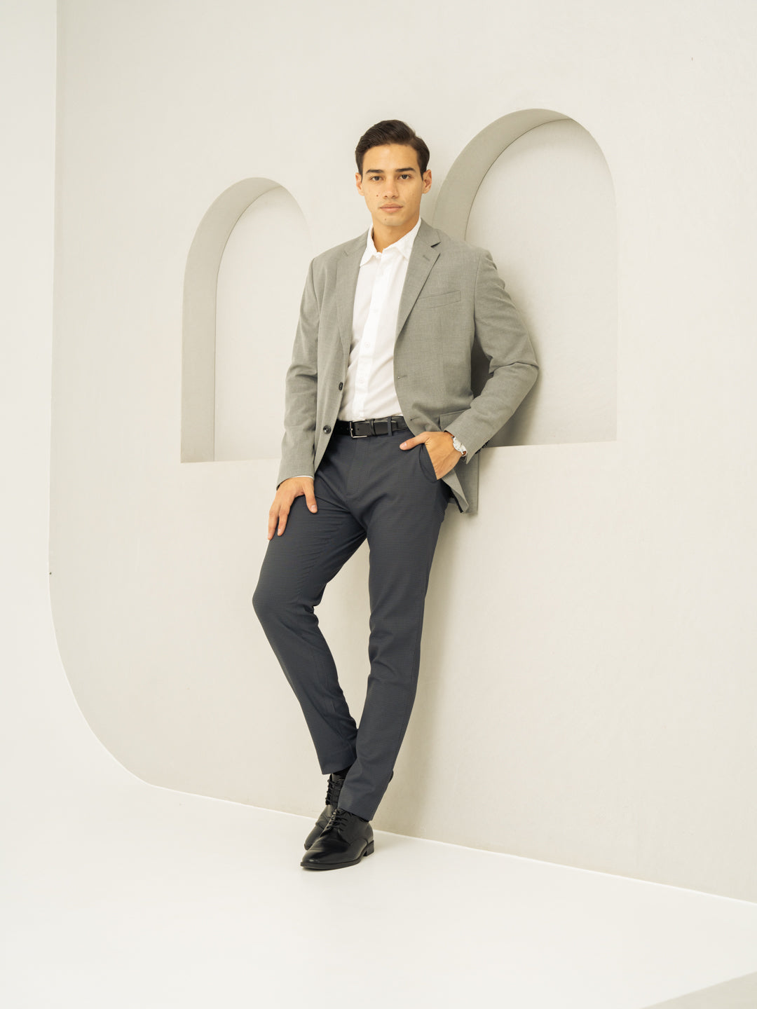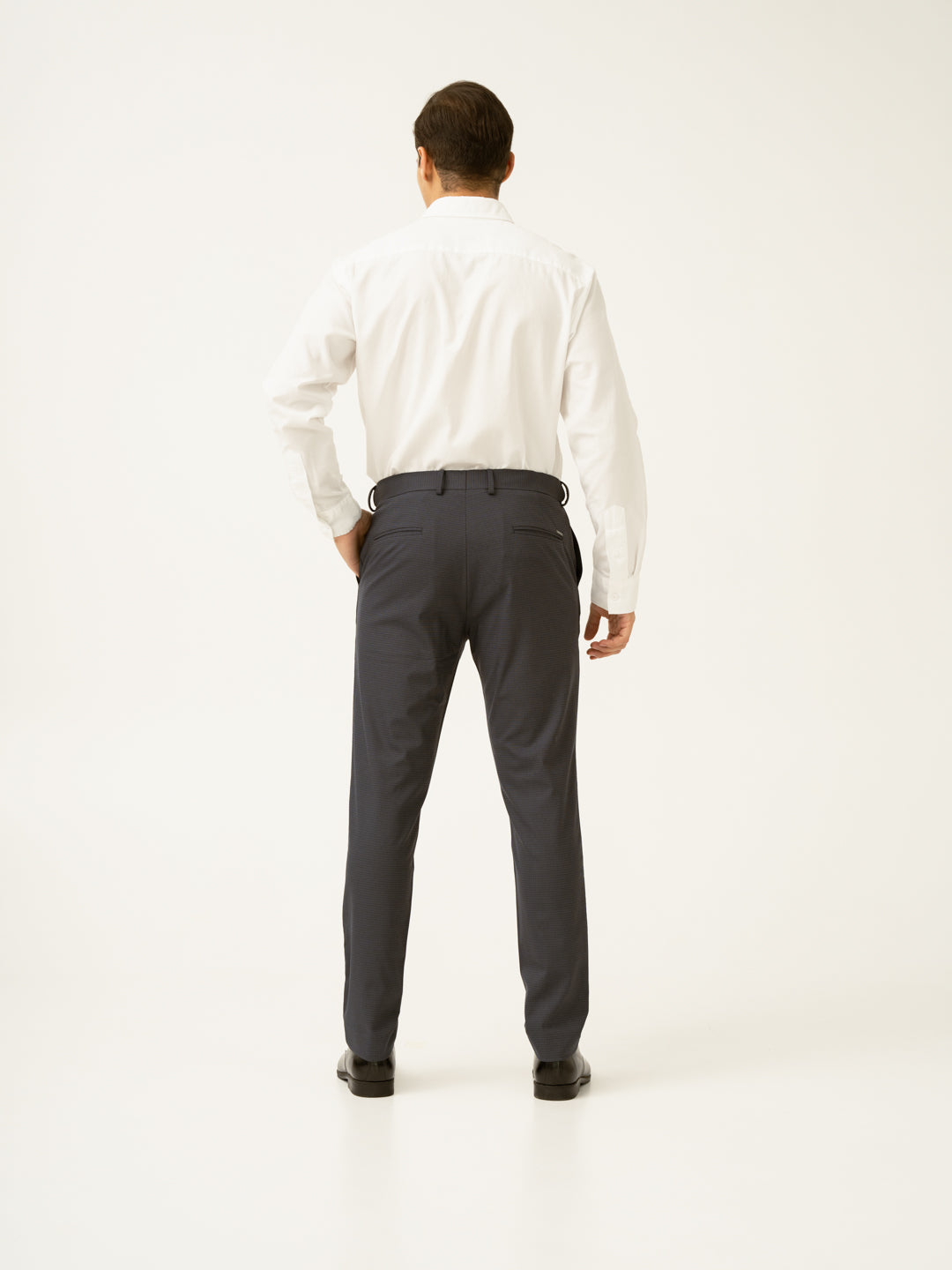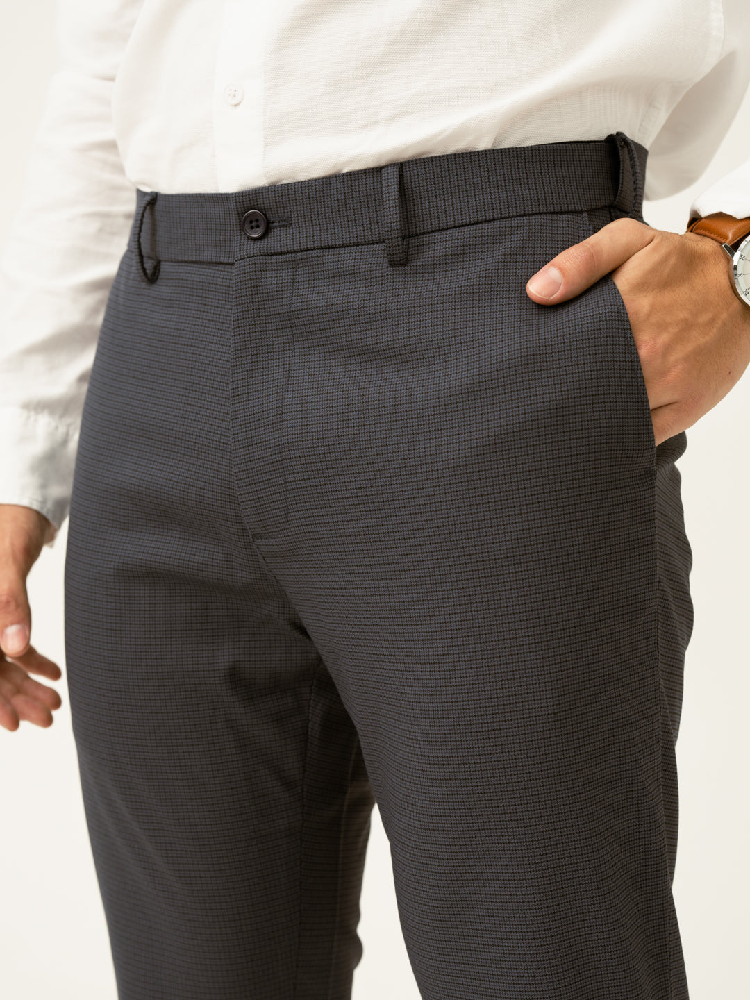 "For the man who likes understated sharpness, the Gunmetal Grey Micro Checks Slim Fit Stretch Formal Trousers are a perfect pick. Designed with 4-way stretch, a FlexTech waistband, and wrinkle-resistant fabric, these dark grey stretchable formal trousers ensure ease and sophistication all day long. The grey micro-check pattern adds just the right touch of refinement, making them ideal for work meetings or weekend socials. Lightweight, breathable, and built for movement, they keep up with your fast-paced life—because real style is effortless