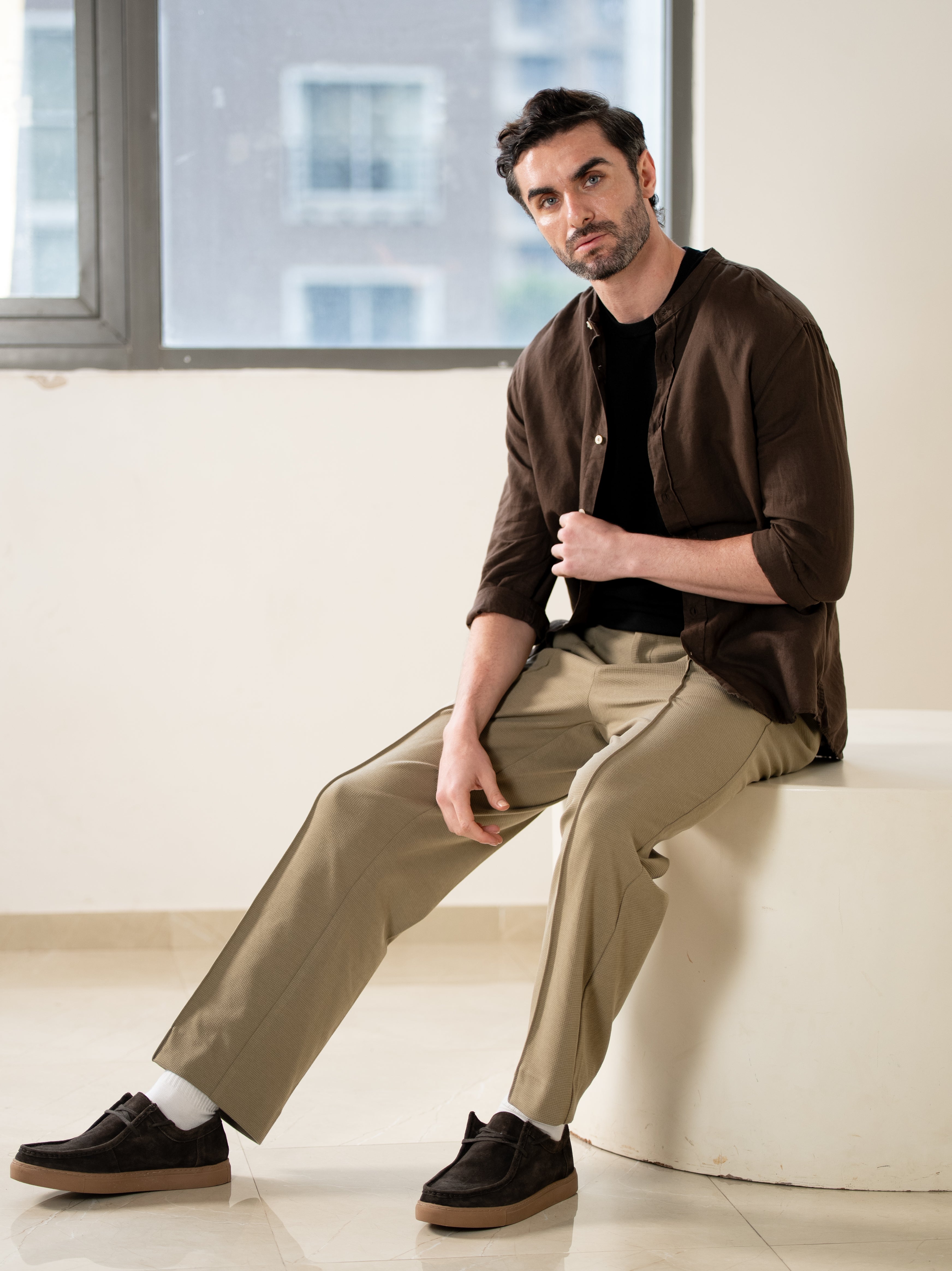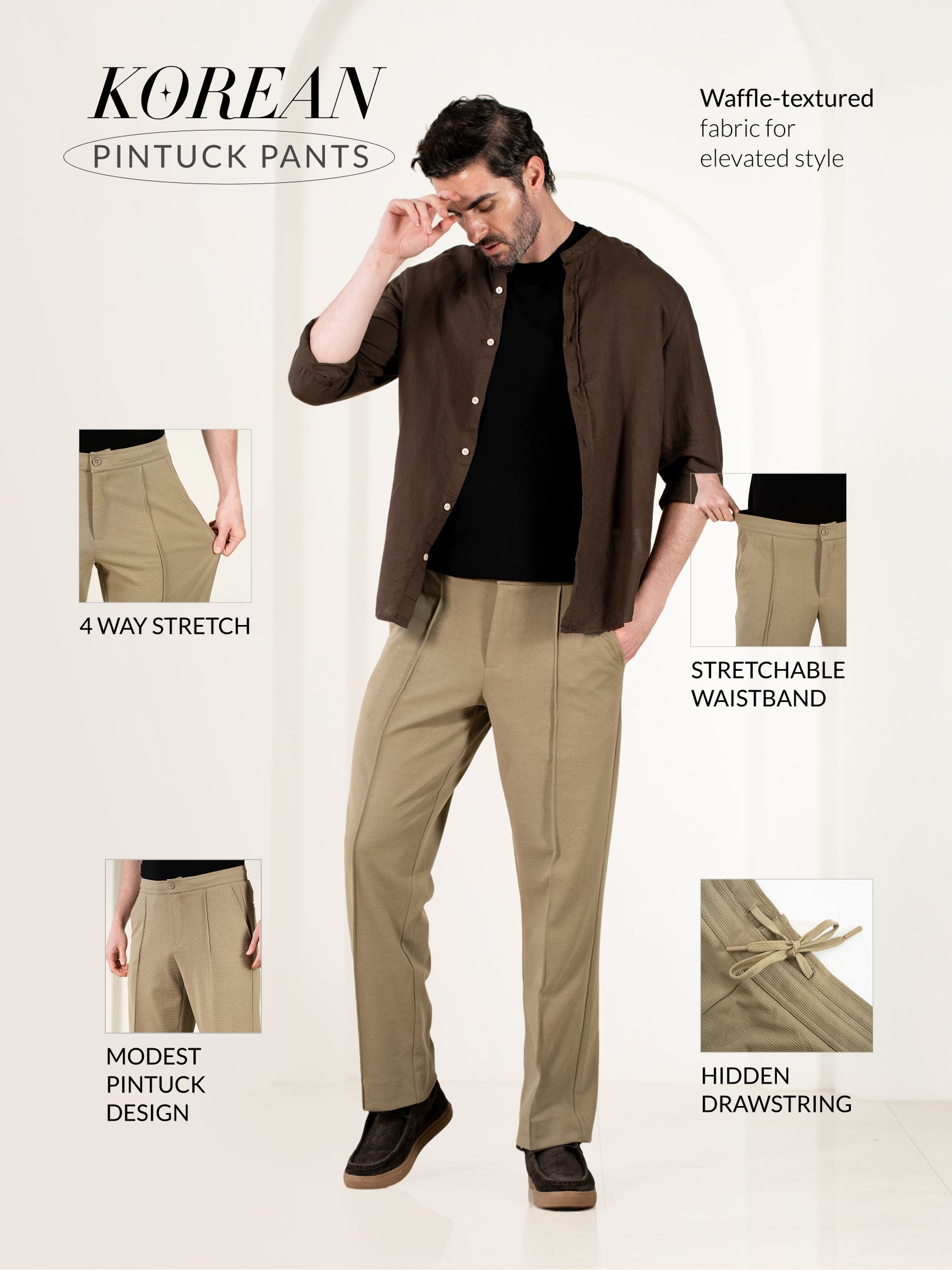 These Hawk Khaki Korean pintuck pants are your secret weapon—sleek, effortless, and always in control. The relaxed fit keeps you comfortable, while the sharp pintucks add a touch of structure. Crafted with 4-way stretch fabric, they move as smoothly as your best one-liner. Plus, the wrinkle-resistant, lightweight, and moisture-wicking design keeps them looking fresh all day. Whether you’re making a power move at work or a casual flex at dinner, these black relaxed fit korean pintuck pants for men ensure you stay sharp without breaking a sweat.