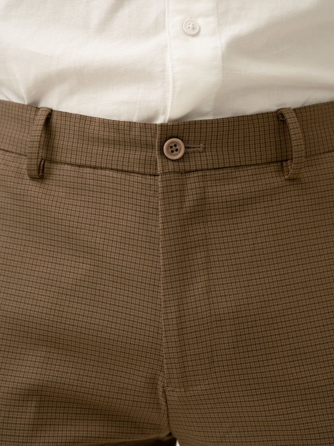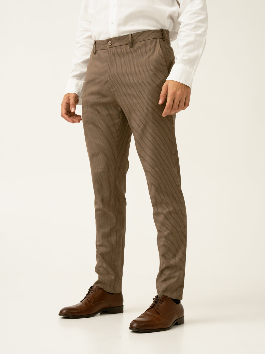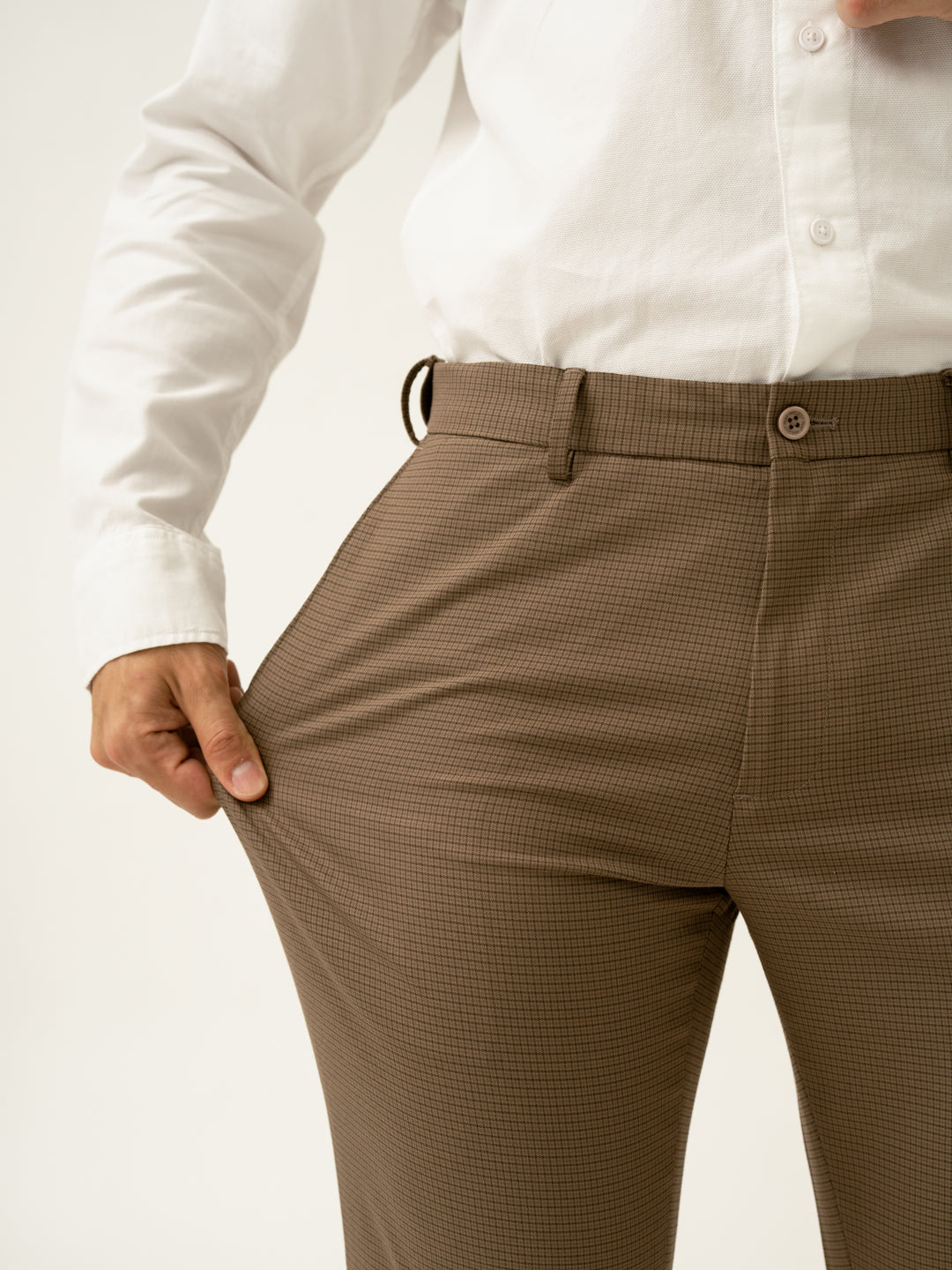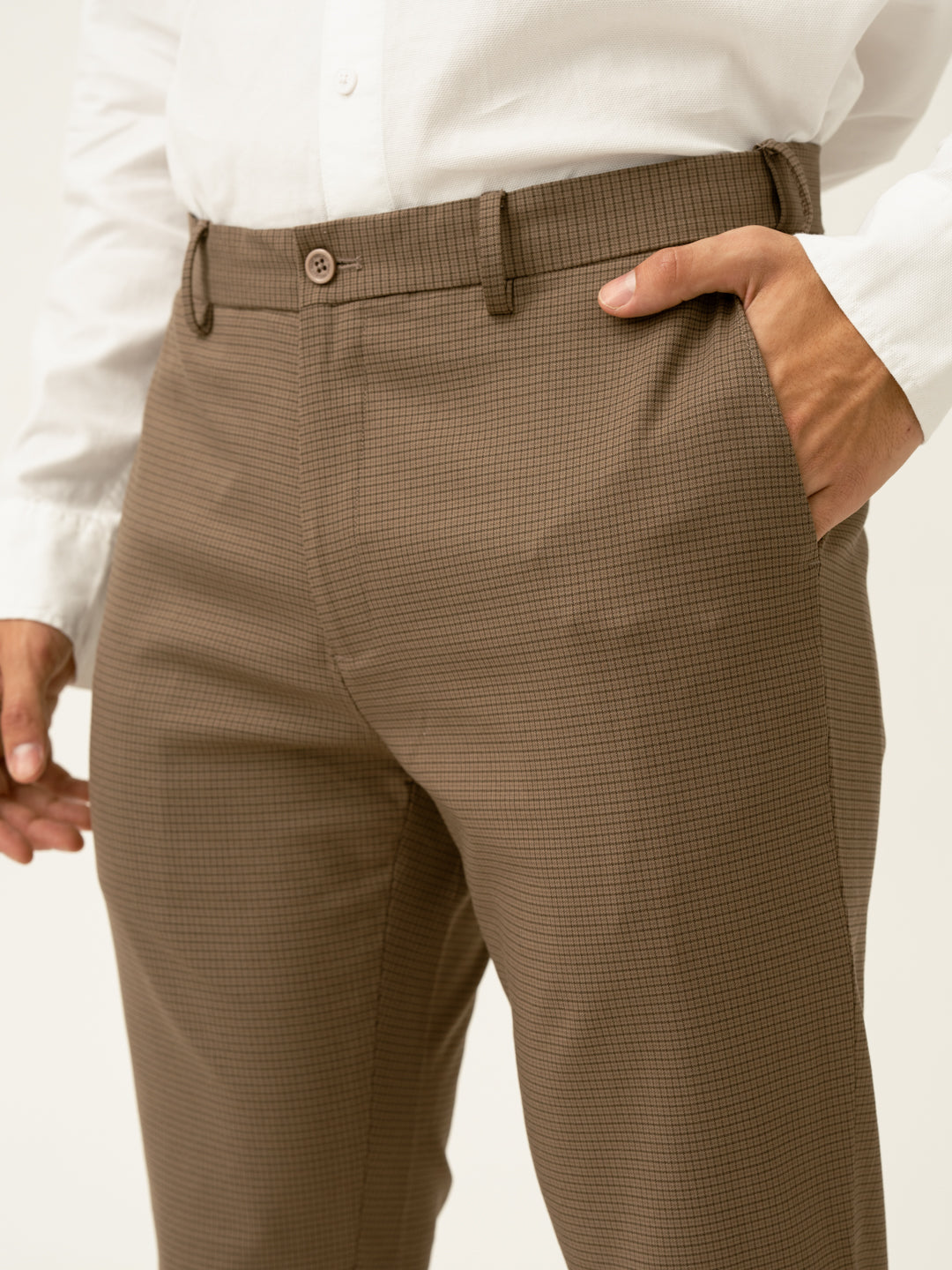 "Refined with a hint of warmth, the Hazel Brown Micro Checks Slim Fit Stretch Formal Trousers redefine business casual. These brown stretchable formal trousers feature 4-way stretch, a FlexTech waistband, and wrinkle-resistant fabric for unmatched comfort. The micro-check pattern adds subtle depth, making them versatile for work, travel, or weekend plans. Lightweight and breathable, they keep you looking sharp without compromising on ease. Whether you're presenting in the office or stepping out for drinks, these trousers bring effortless sophistication to any setting.