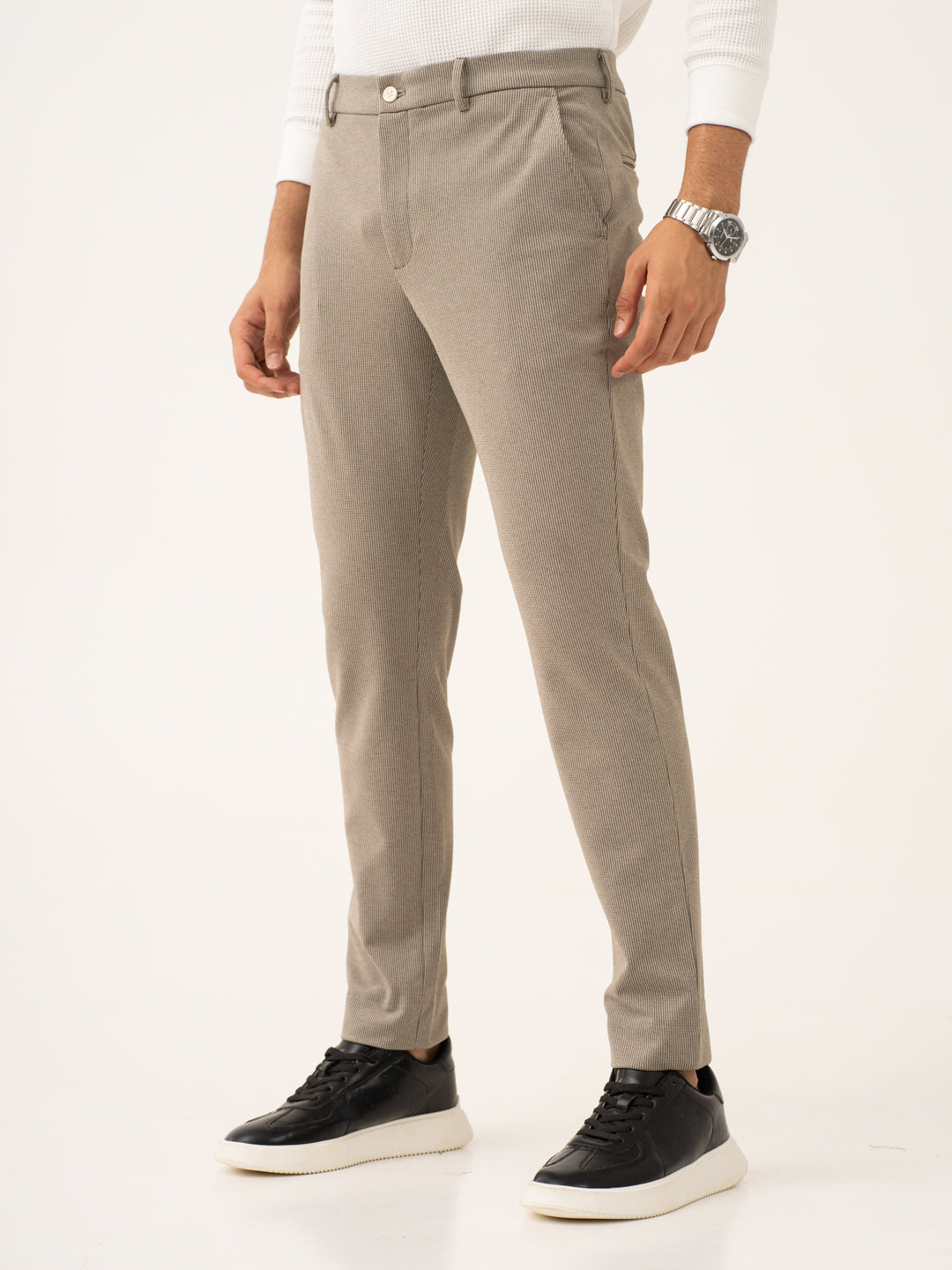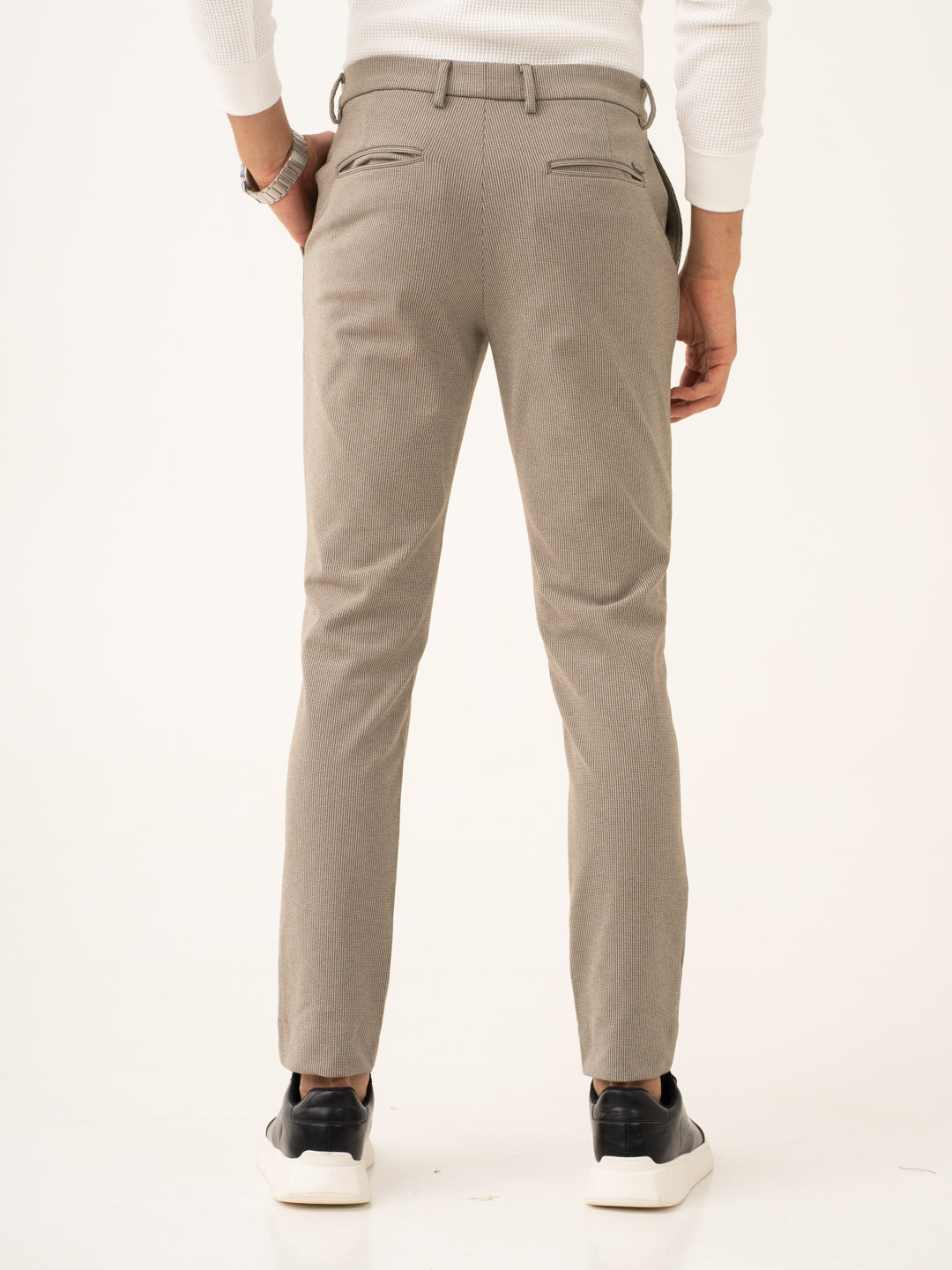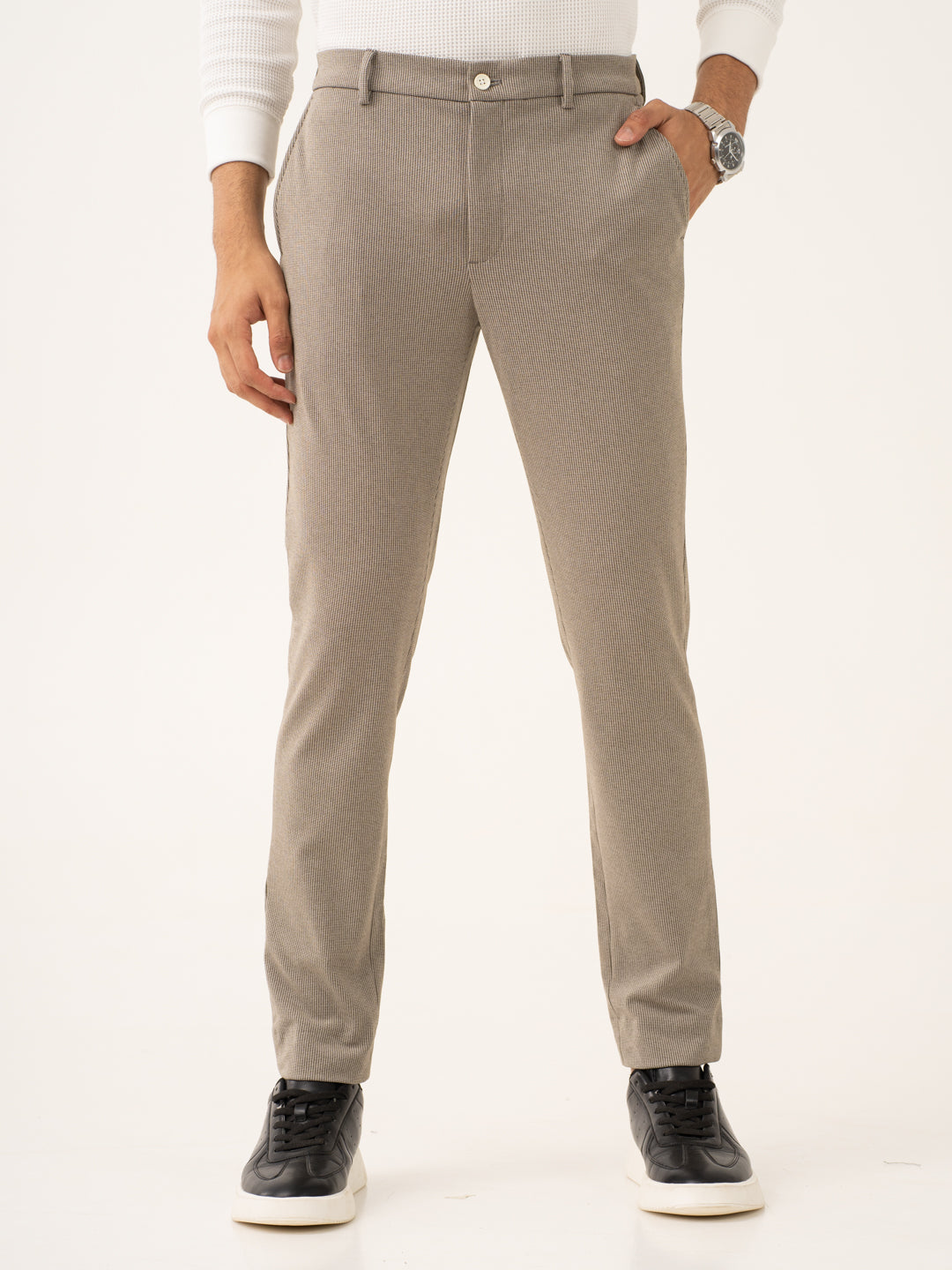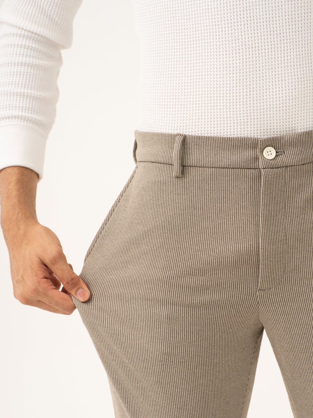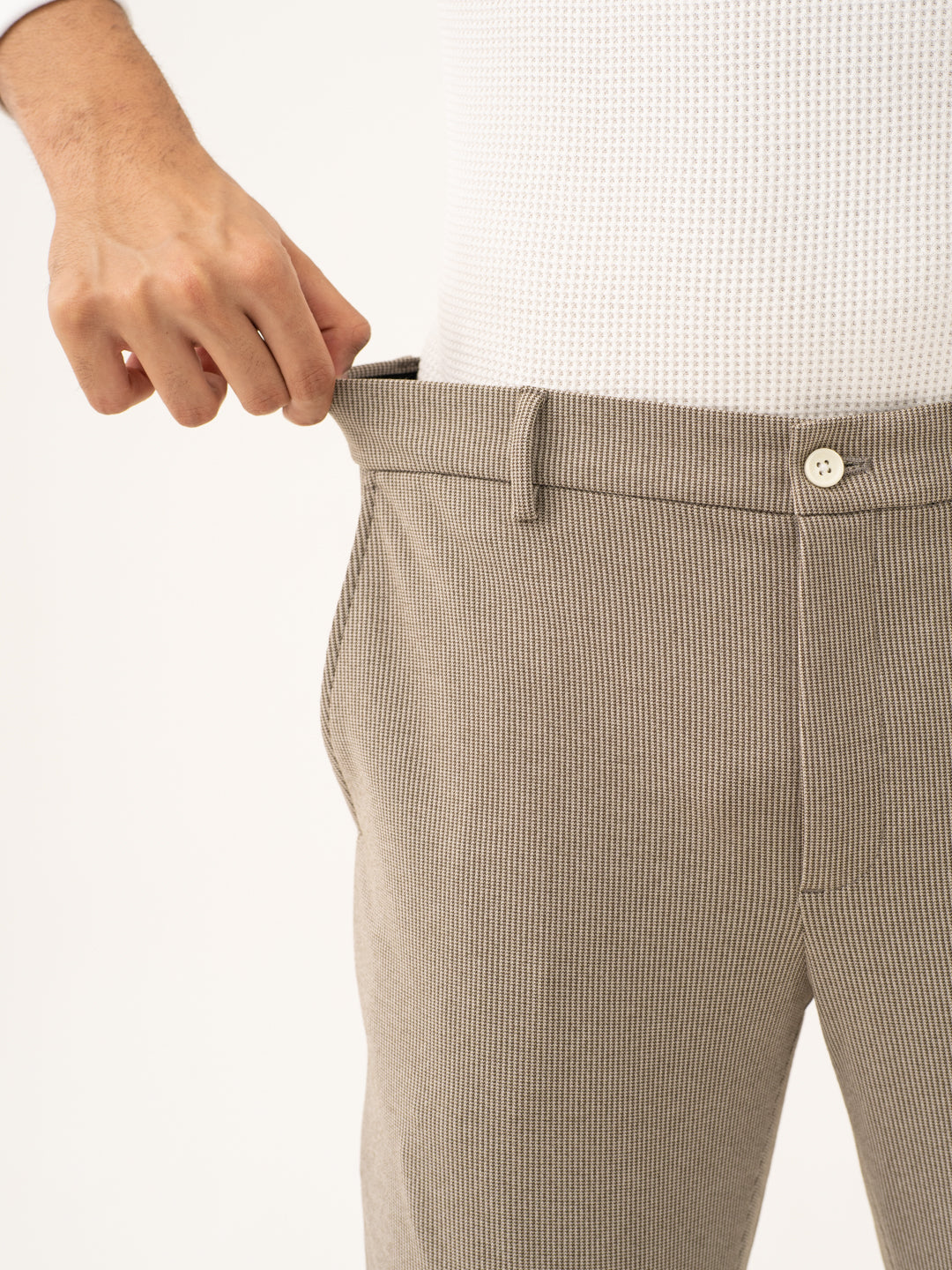 Jupiter Brown Houndstooth Power-Stretch Pants offer the perfect combination of comfort, style, and versatility. These custom-made Jupiter Brown Houndstooth Stretchable Trousers are made from a high-stretch fabric that adapts to your movements. The warm brown color paired with the subtle houndstooth pattern creates a polished yet relaxed look. These Brown Stretchable Trousers are lightweight, breathable, and wrinkle-resistant, making them ideal for long days and travel. Whether you’re at the office or out for a night out, these custom-made pants will provide you with all-day comfort and style.