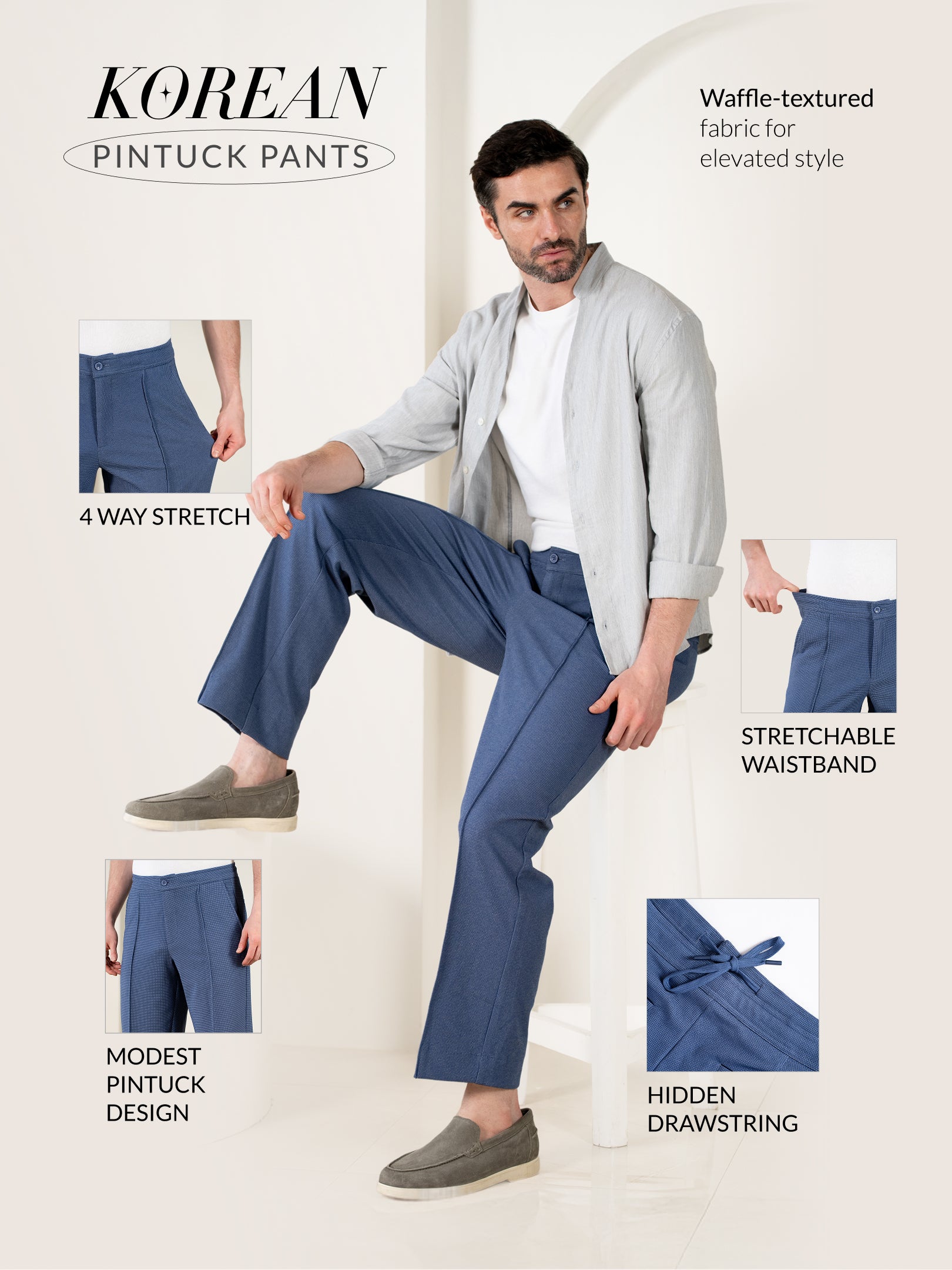 These Kai Blue Korean pintuck pants are your secret weapon—sleek, effortless, and always in control. The relaxed fit keeps you comfortable, while the sharp pintucks add a touch of structure. Crafted with 4-way stretch fabric, they move as smoothly as your best one-liner. Plus, the wrinkle-resistant, lightweight, and moisture-wicking design keeps them looking fresh all day. Whether you’re making a power move at work or a casual flex at dinner, these black relaxed fit korean pintuck pants for men ensure you stay sharp without breaking a sweat.