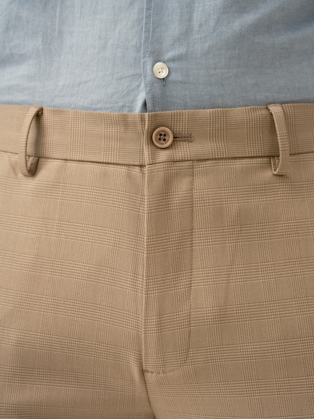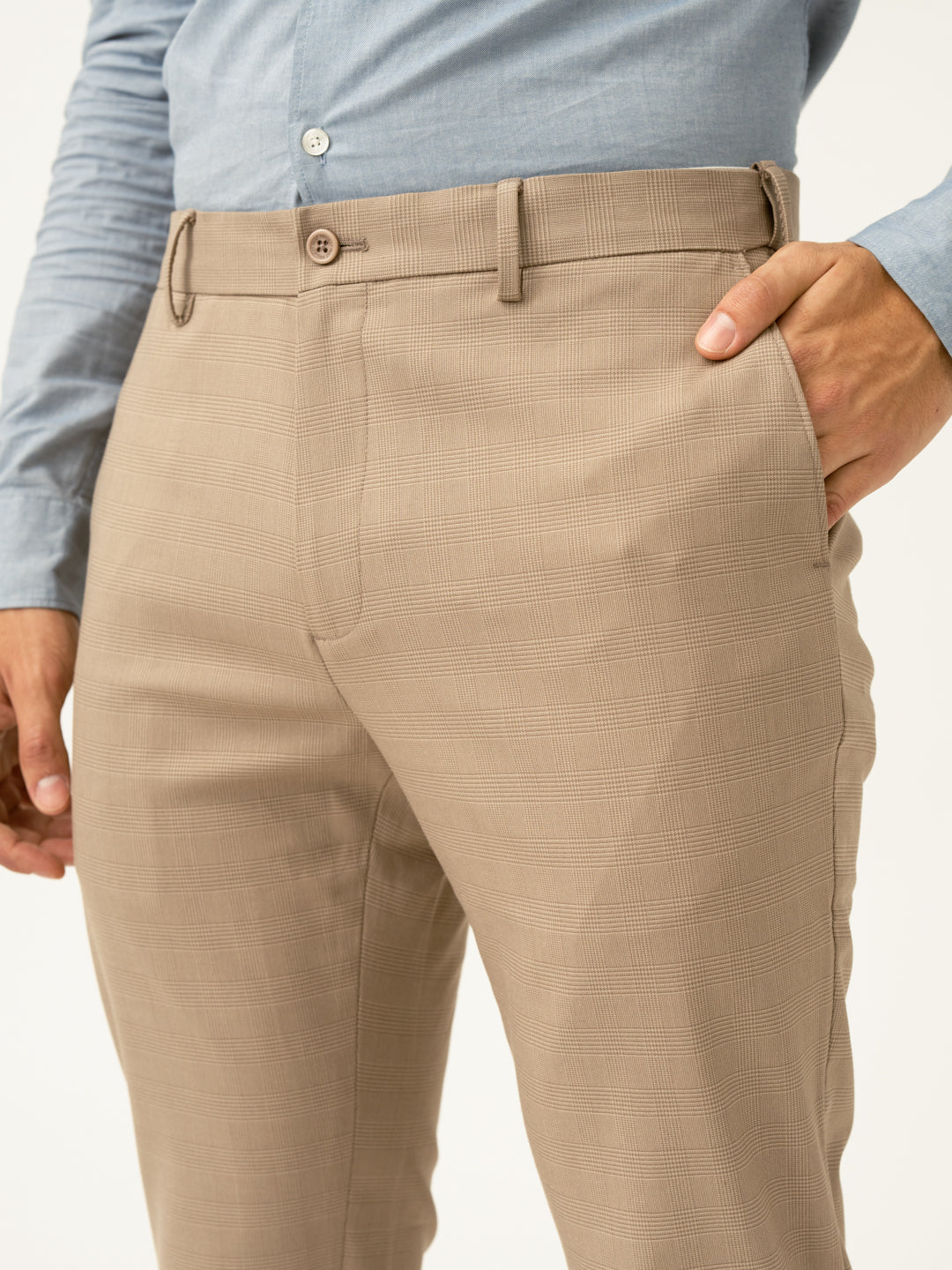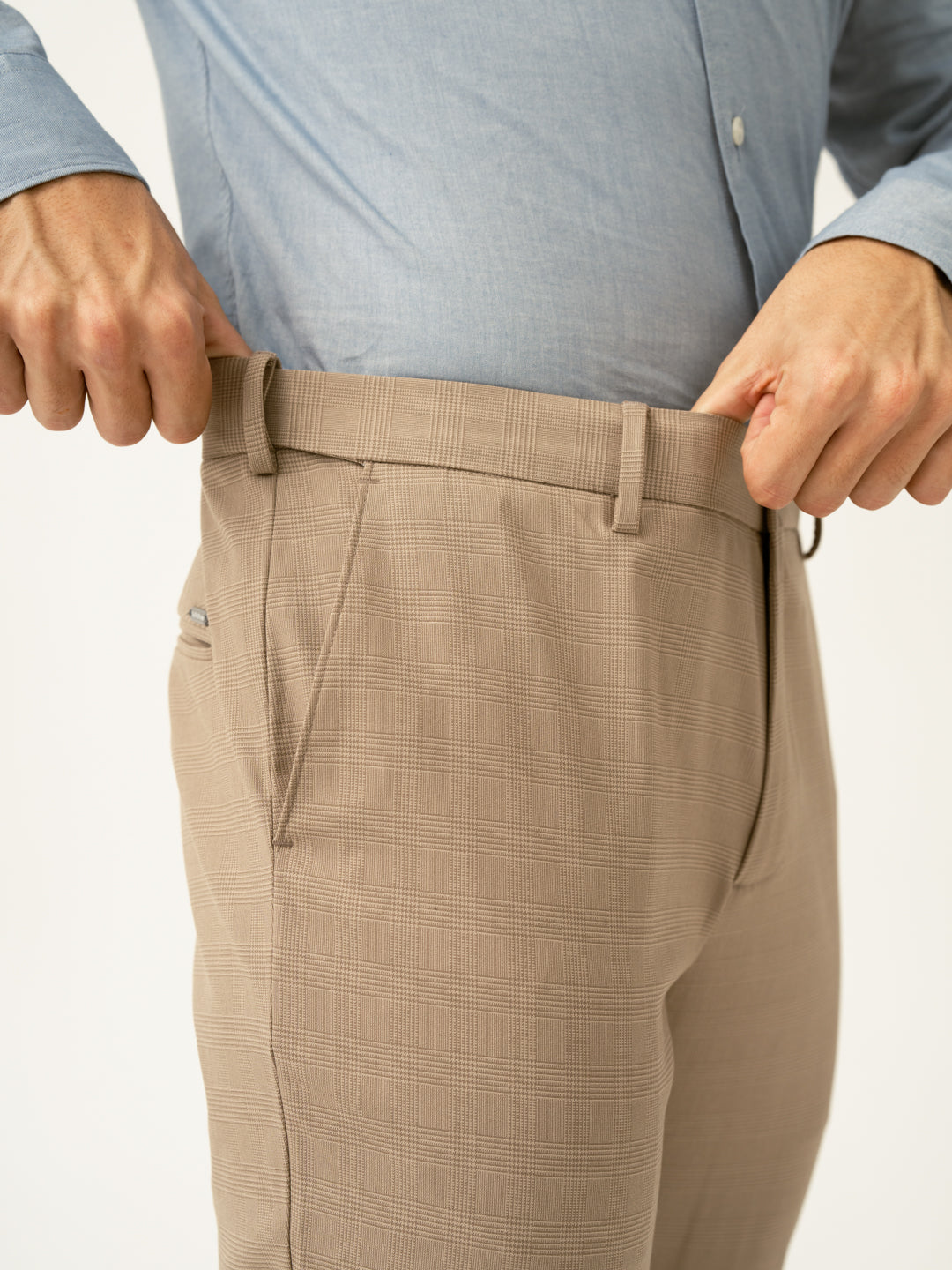 "A fresh take on formals. The Sand Beige Checks Slim Fit Stretch Formal Trousers add subtle elegance to your everyday style. With 4-way stretch, a FlexTech waistband, and wrinkle-resistant fabric, these beige stretchable formal trousers provide comfort without compromising sophistication. Whether you're sealing deals or heading for an upscale dinner, these trousers ensure you stay effortlessly polished. The timeless check pattern paired with modern stretch fabric makes these a wardrobe essential.