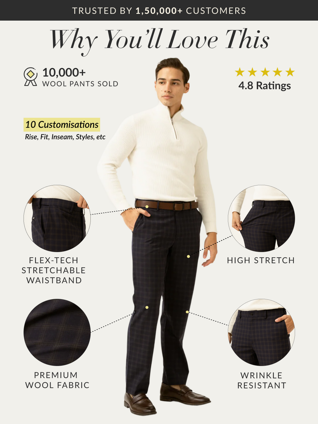 For all our custom-made pants we offer free alterations subject to T&C. We do not offer returns, exchanges or refunds on custom-made pants. The request for an alteration, exchange or return needs to be logged in within 14 days of delivery of the product. You can raise an alteration request by clicking here. and you can reach out to us via WhatsApp on 8657735200 if you need any additional assistance. Refer to our detailed Alterations and Returns policy for more information