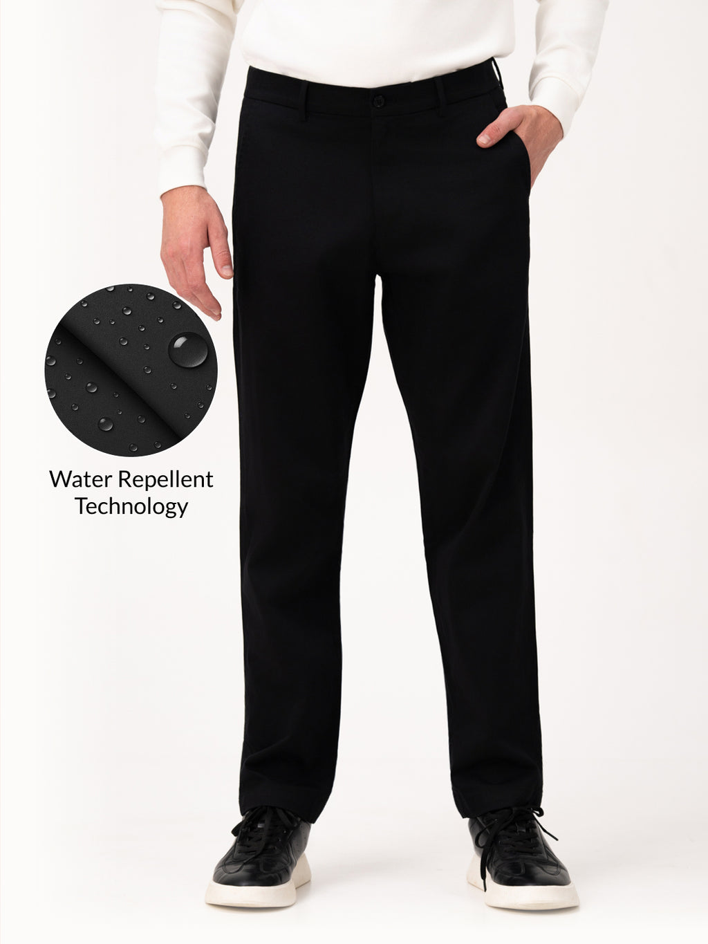 Crafted using a premium blend of 93% Cotton & 7% Elastane to give you stretch comfort for all-day wear with smart water & stain repellent technology for every season. Our model has a 34 waist and is wearing size 34 in Relaxed Fit.