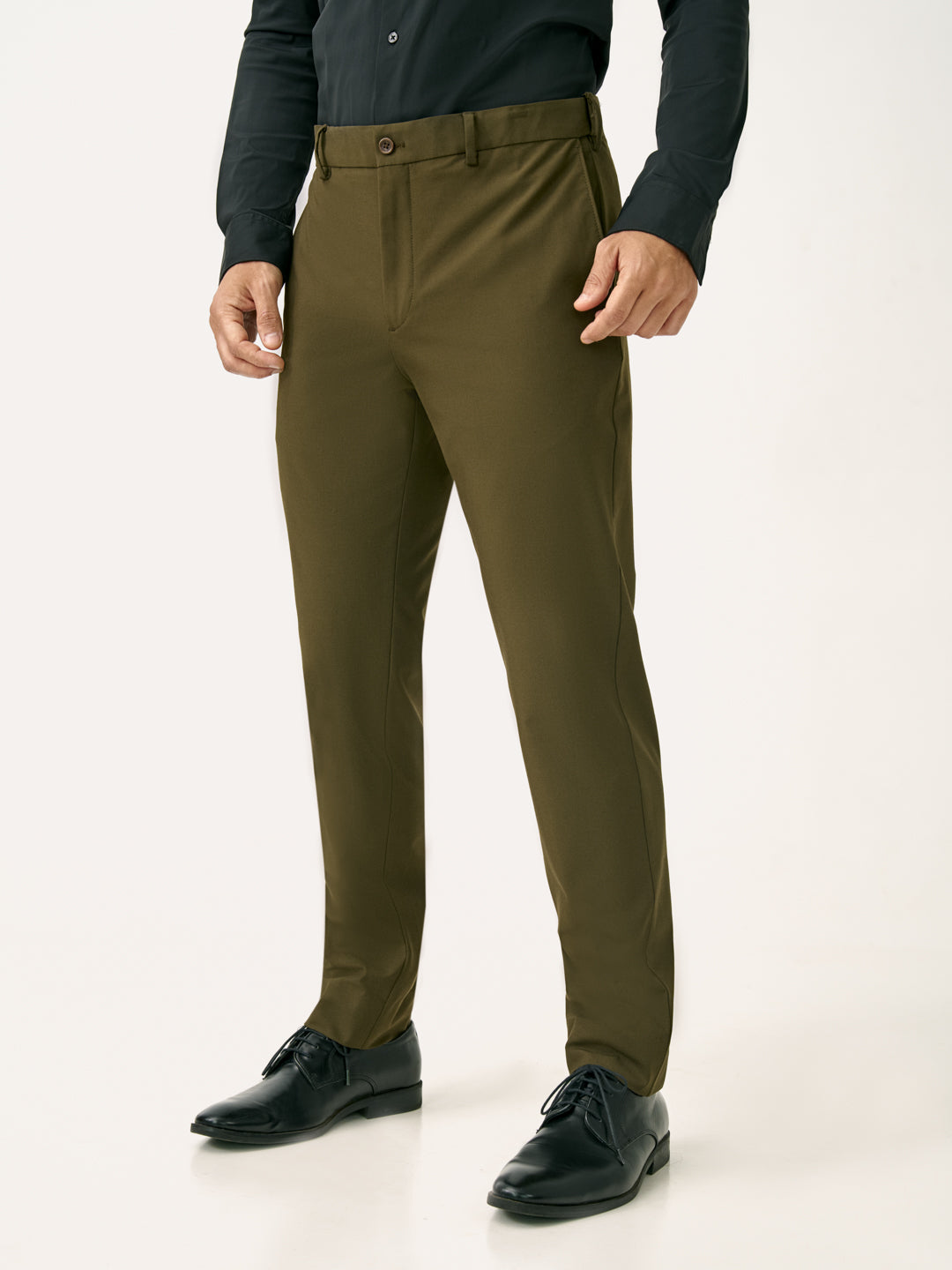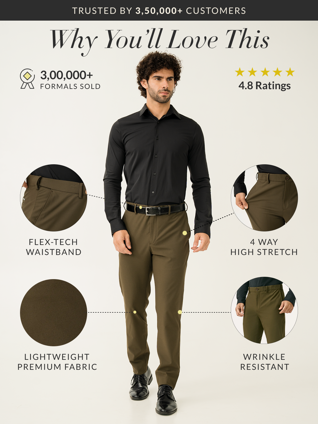 "The Always Olive Slim Fit Stretch Formal Trousers are built for men who never hit pause. From boardrooms to after-hours plans, these olive stretchable formal trousers move with you. 4-way stretch, a FlexTech waistband, and wrinkle-resistant fabric keep things smooth, while breathable, moisture-wicking fabric ensures you stay fresh. Lightweight, sharp, and endlessly versatile, they handle long schedules and unexpected plans like a pro. Some trousers are occasional wear. These? They’re always ready. So go ahead—set the pace. Your pants can keep up.