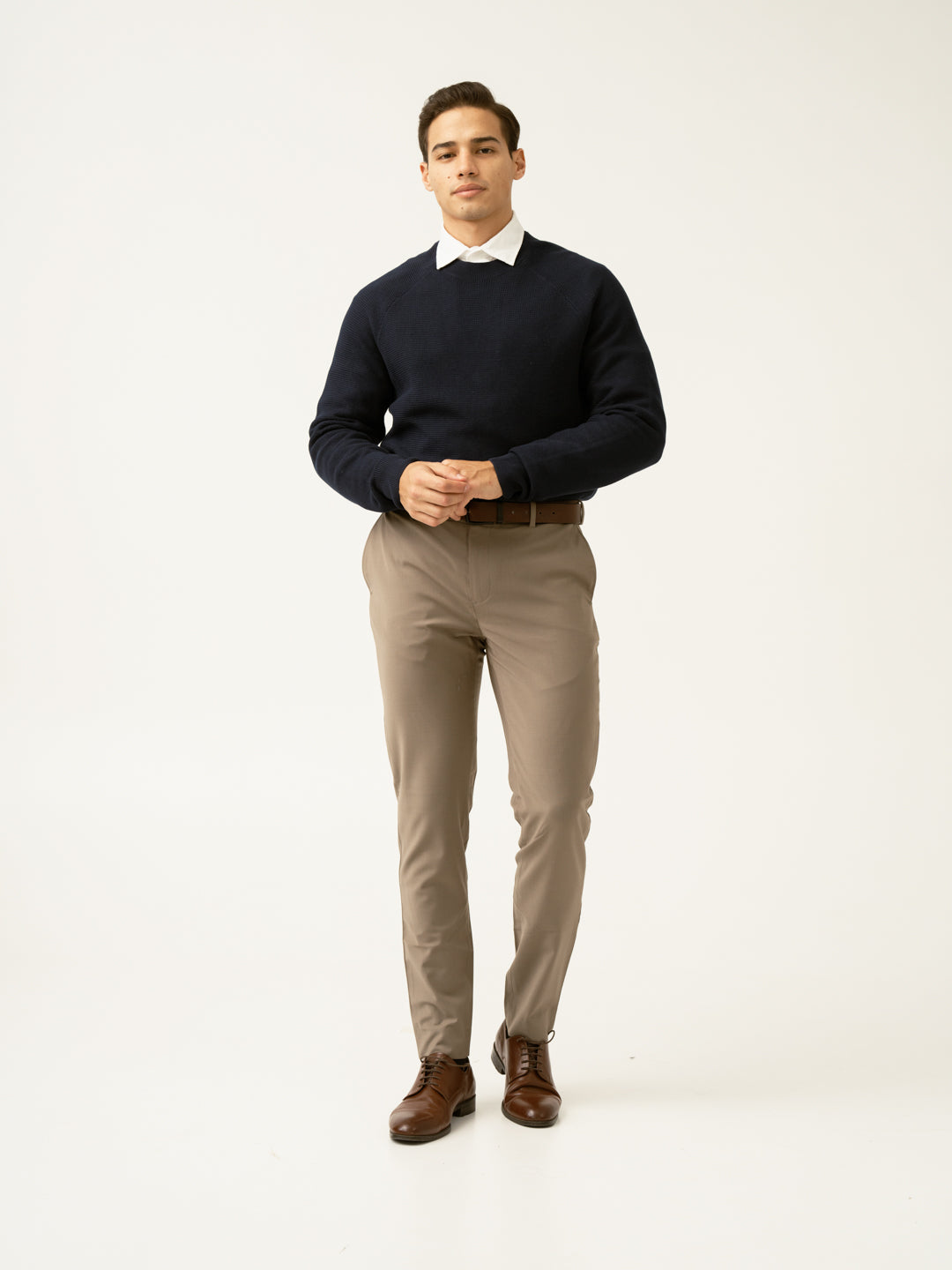 Crafted using a premium blend of 52% Merino Wool, 43% Polyester and 5% Elastane for lightweight wear & supreme thermo-regulating comfort. Our model in the images wears a Slim Fit.