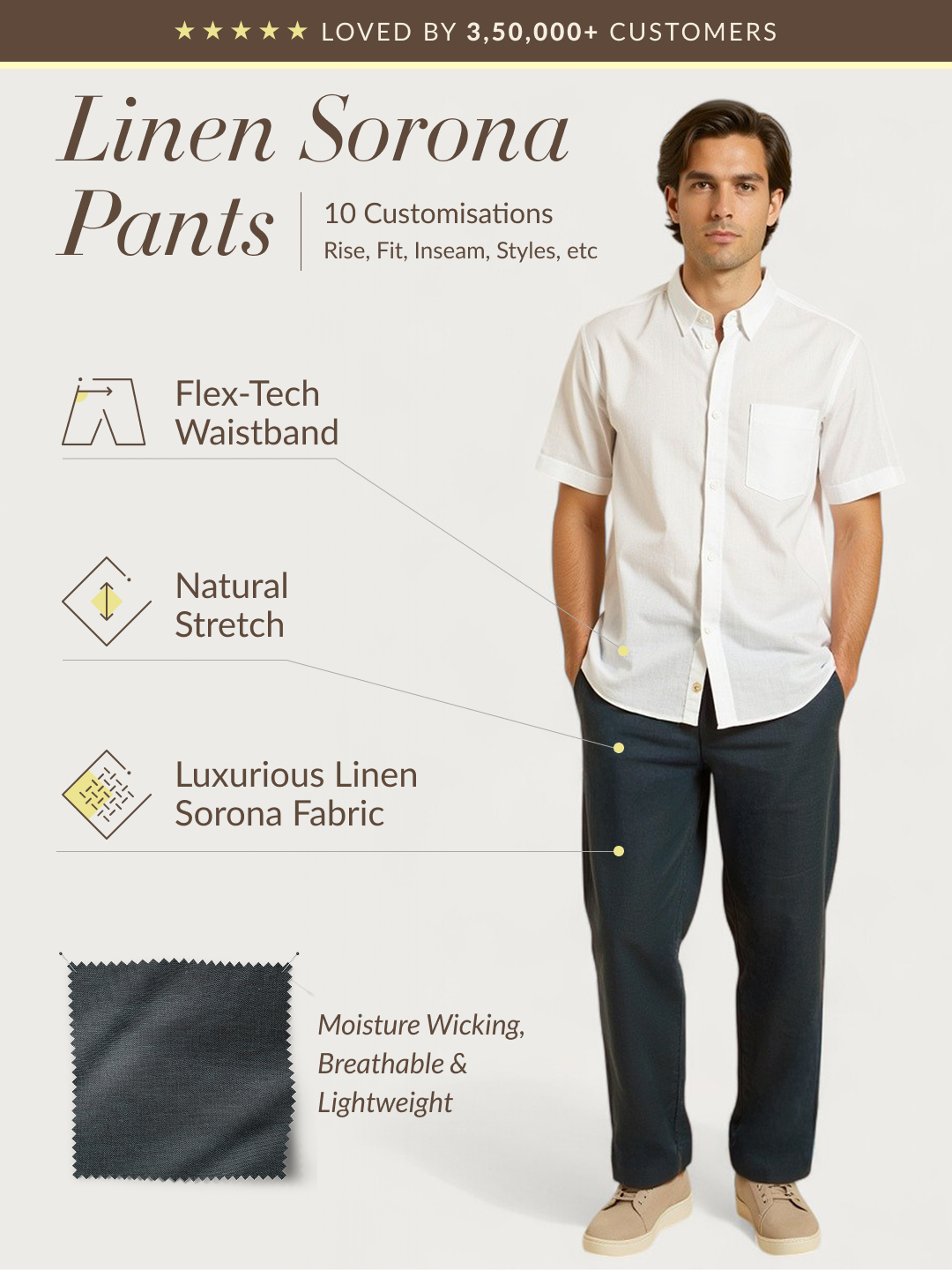 Think of Linen Sorona as the grown-up, cousin of your classic linen pants. Still light, breezy, and breathable perfect for Indian weather but now with real staying power. Crafted from a premium 69% Linen and 31% Sorona blend, it doesn’t wrinkle at the first sign of movement or lose shape after a long day. Sorona adds stretch, recovery, and durability so your pants move with you, resist creases, and stay polished from AM to PM. It’s the comfort of linen with the brains of performance-wear. You’ll rethink all your other trousers.