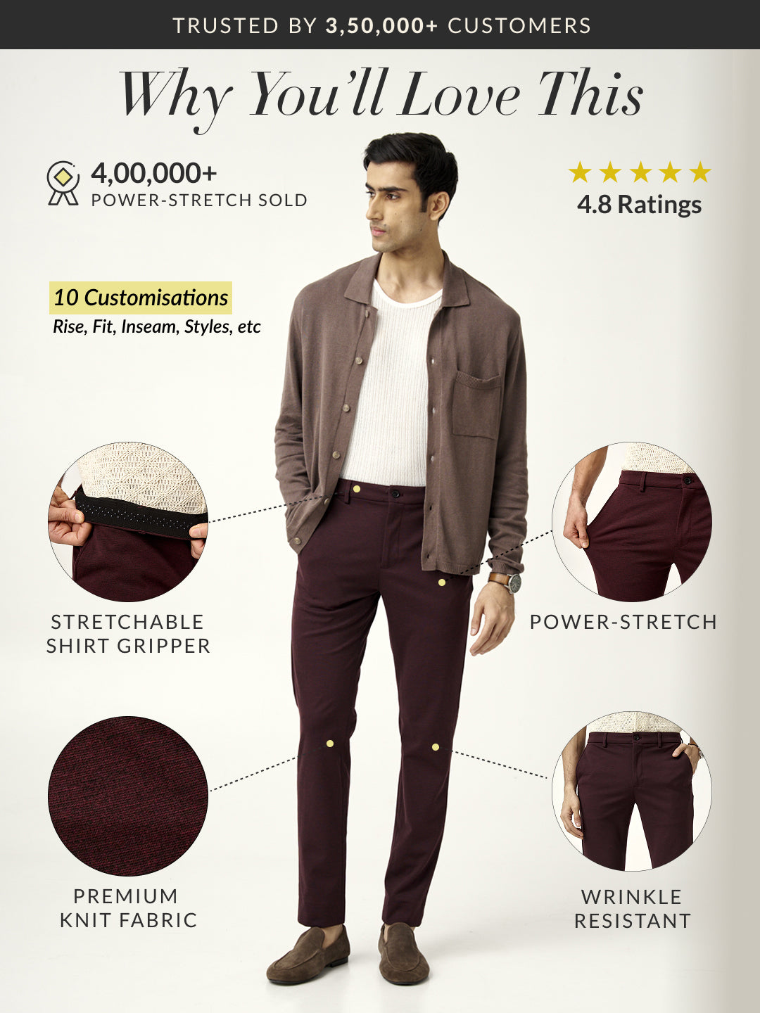 Looking for a bold switch-up from your everyday trousers? The Plum Wine Power-Stretch Pants are where confidence meets comfort. These plum wine stretchable trousers are rich in tone and attitude—perfect for those who dress to stand out. Tailored to your frame using four-way stretch fabric, they’re built to move with ease through long days and late nights. With moisture-wicking and wrinkle-resistant features, you’ll look as good as you feel. Whether it’s date night or drinks with the crew, this custom-made pair does all the talking—so you don’t have to.