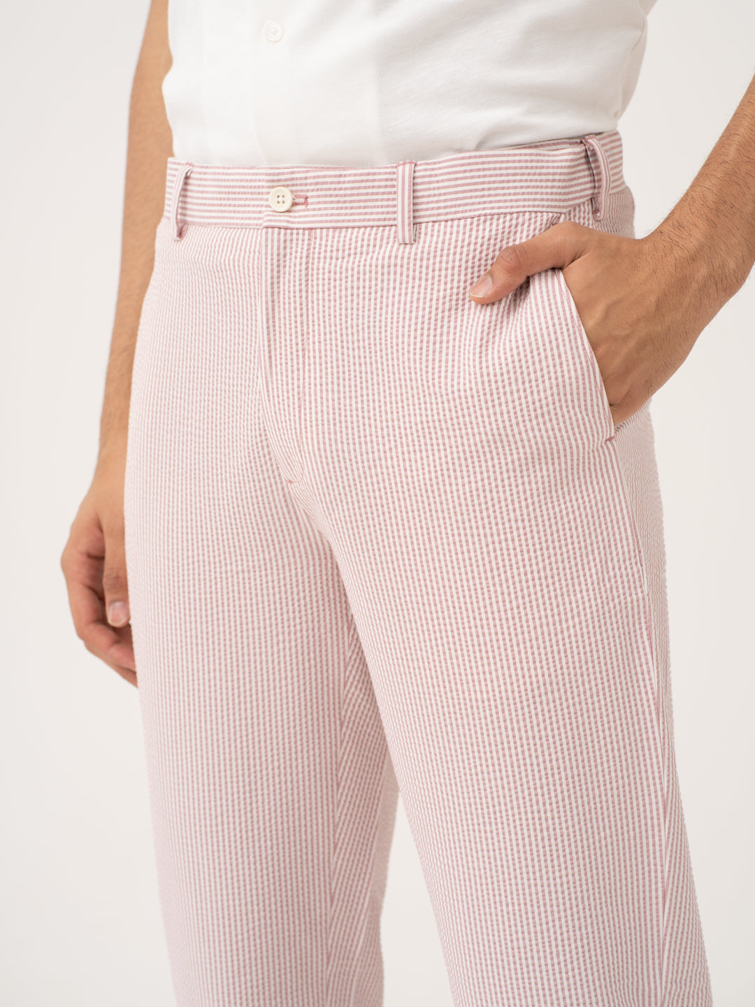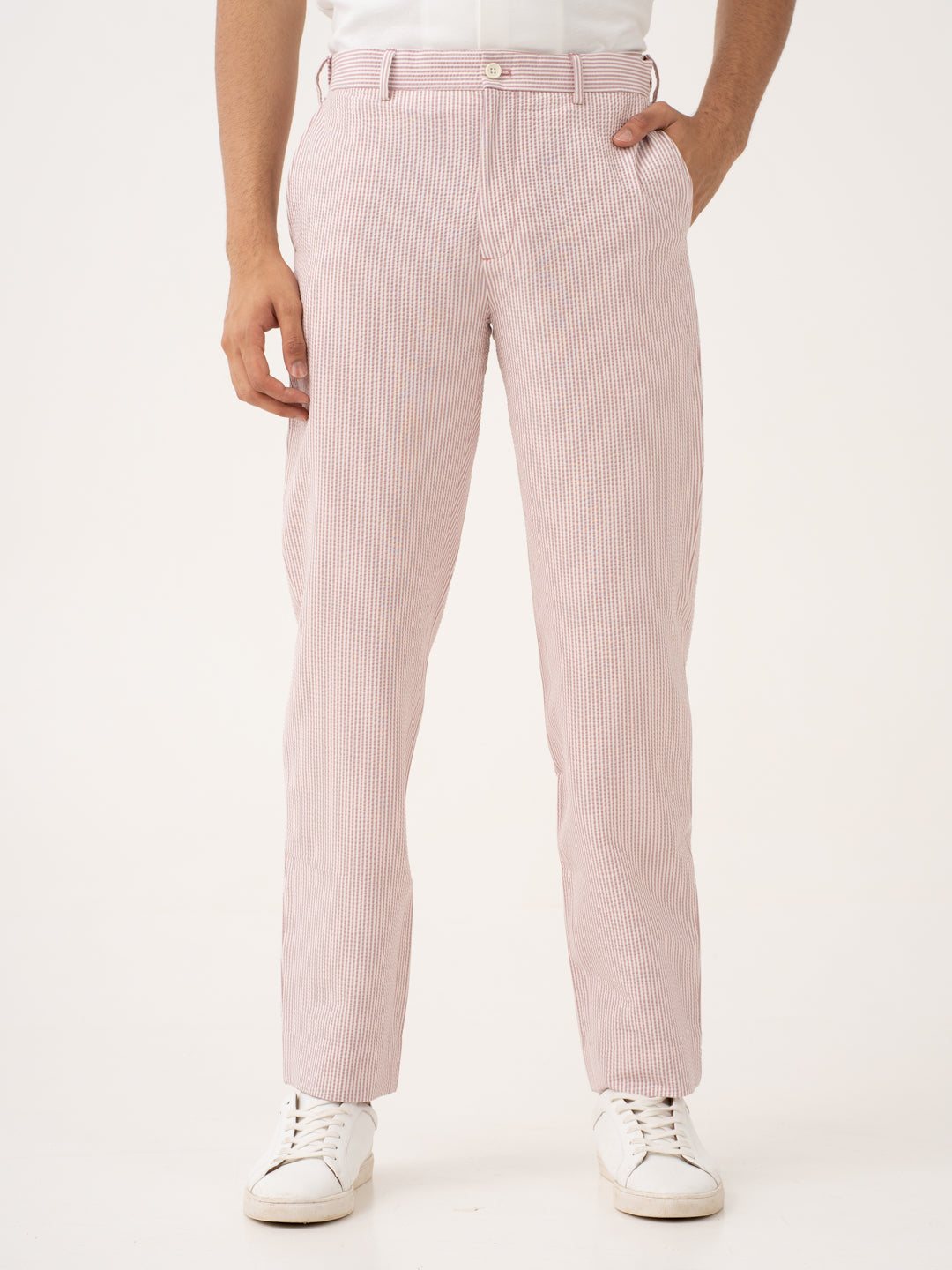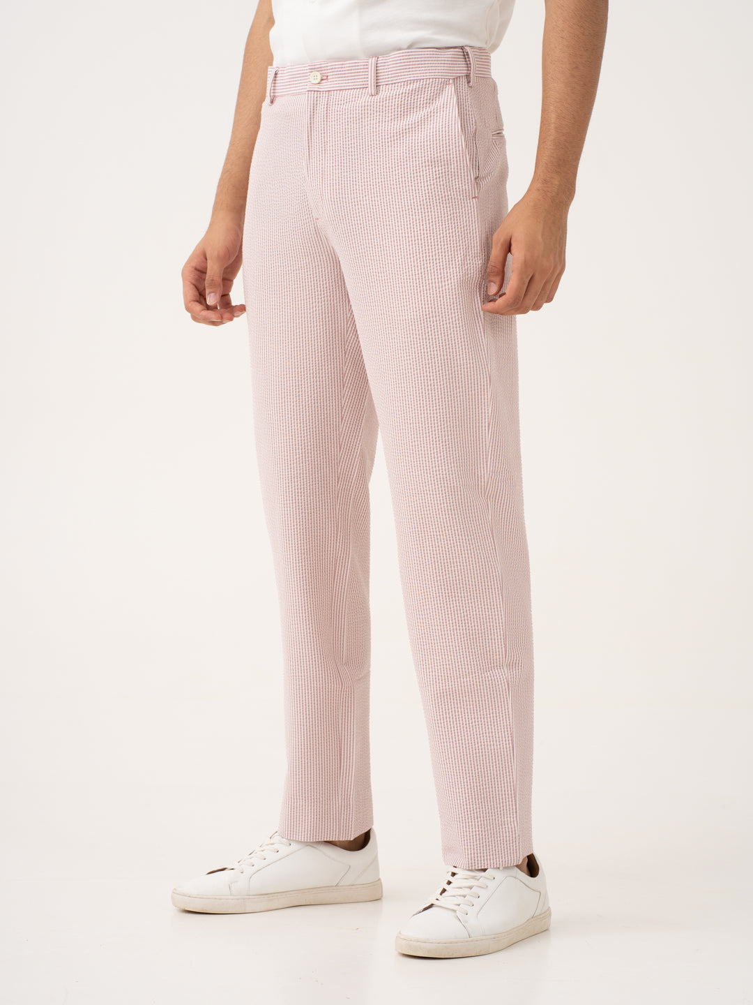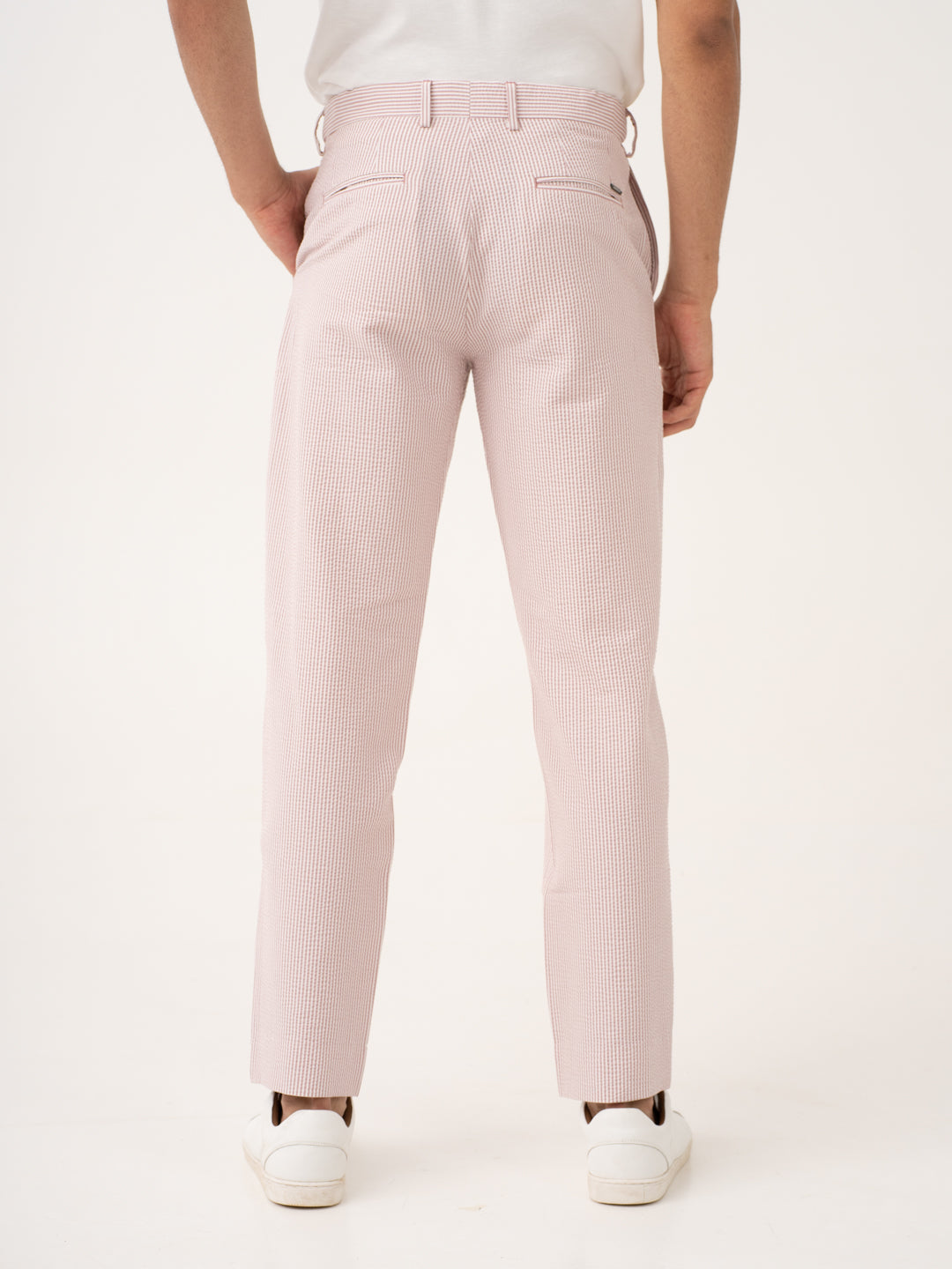 Bring some fire to your wardrobe with the Romeo Rouge Stripes Seersucker Pants. Crafted from a breathable, puckered fabric, these pants offer unparalleled comfort in the hottest weather. The Romeo Rouge stretchable seersucker trousers feature built-in stretch to move with you, while their moisture-wicking properties keep sweat at bay. Wrinkle-resistant and lightweight, these pants maintain their sharp, crisp look no matter how long your day is. Whether you’re dressing up for a night out or keeping it casual, these pants add a bold pop of color to any outfit. Effortlessly cool and stylish, they make every moment a little hotter.