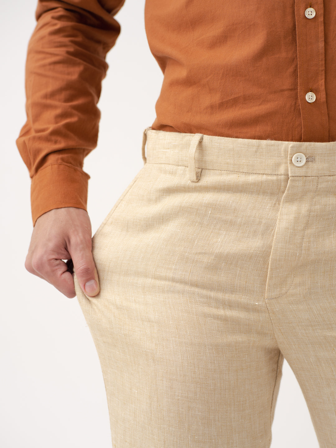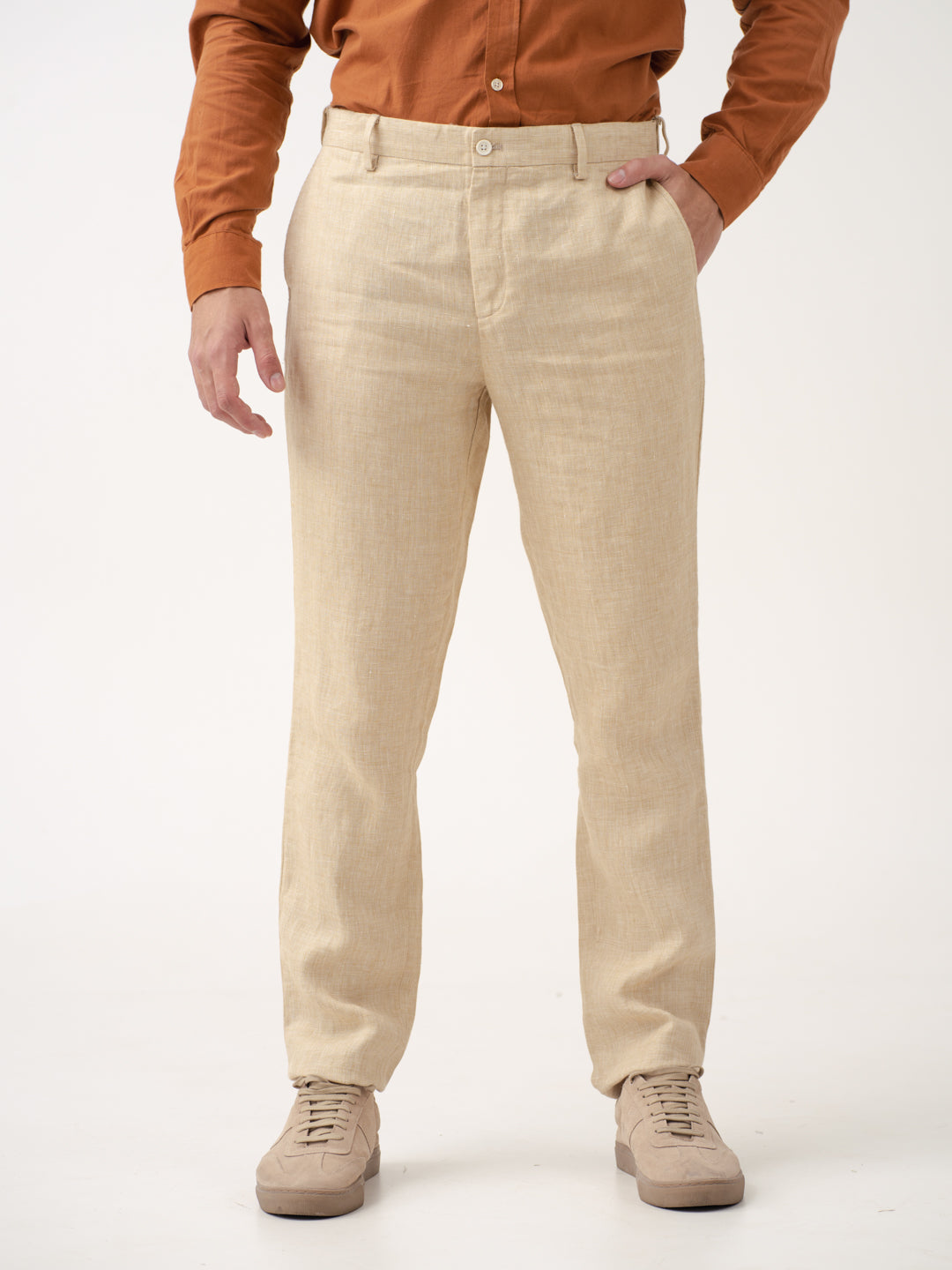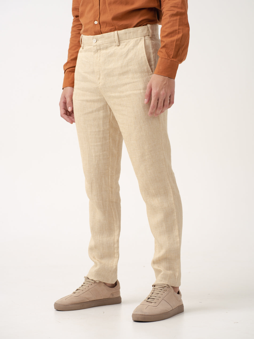 Crafted using 100% Luxurious Linen to give you lightweight, breathable comfort in every wear. Our model in the image wears a Slim Fit.