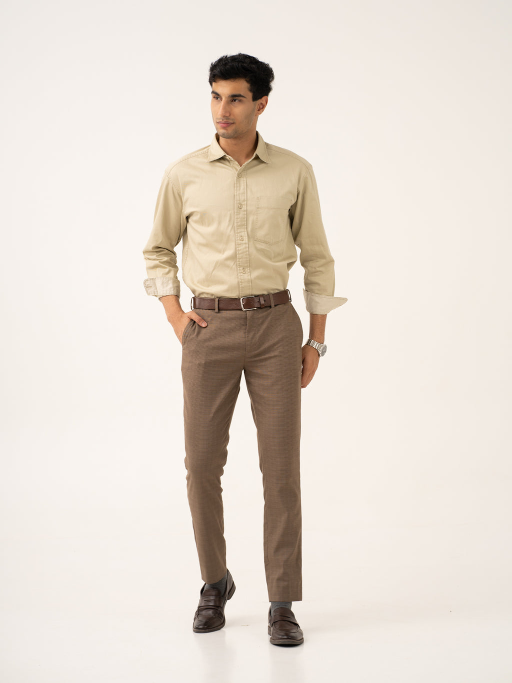 Tavian Khaki Houndstooth Stretch Formal Trousers blend old-school charm with new-age ease. The classic houndstooth pattern is updated with stretch and a flattering custom fit, so you get the best of both worlds. Whether it’s a casual Friday or a client lunch, these khaki houndstooth stretchable formal trousers rise to the occasion. The neutral khaki shade pairs easily with your wardrobe staples, while the subtle texture adds just the right amount of personality. Functional, flexible, and never boring these are a quiet flex in a world full of loud fits.