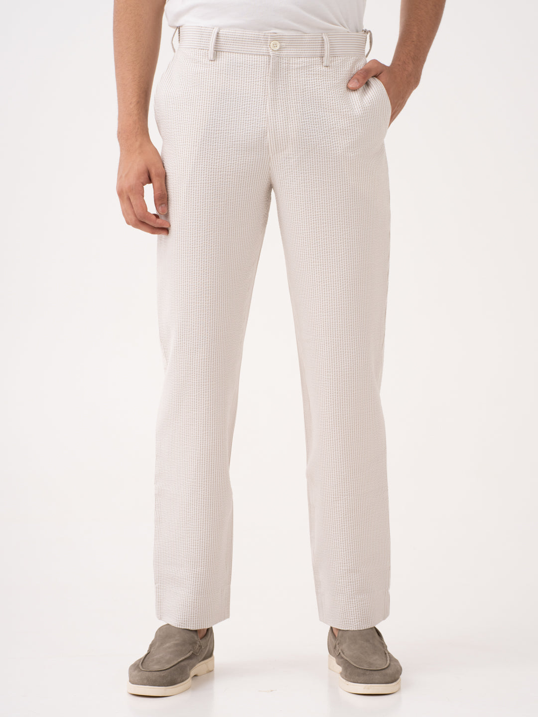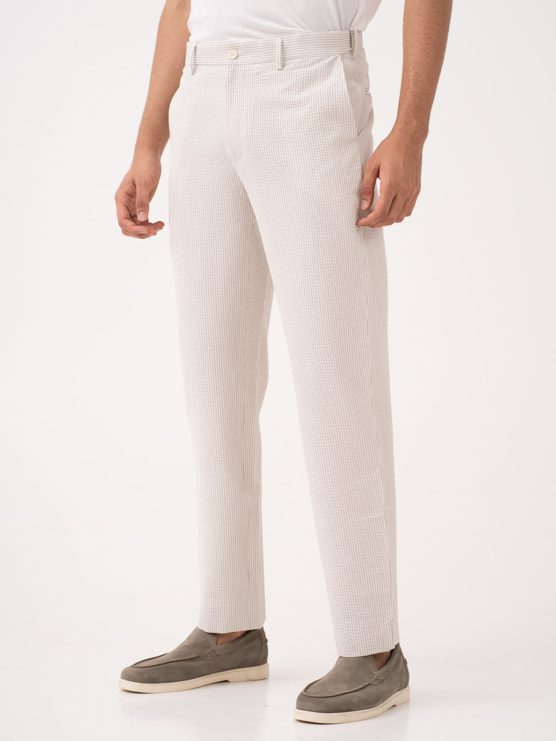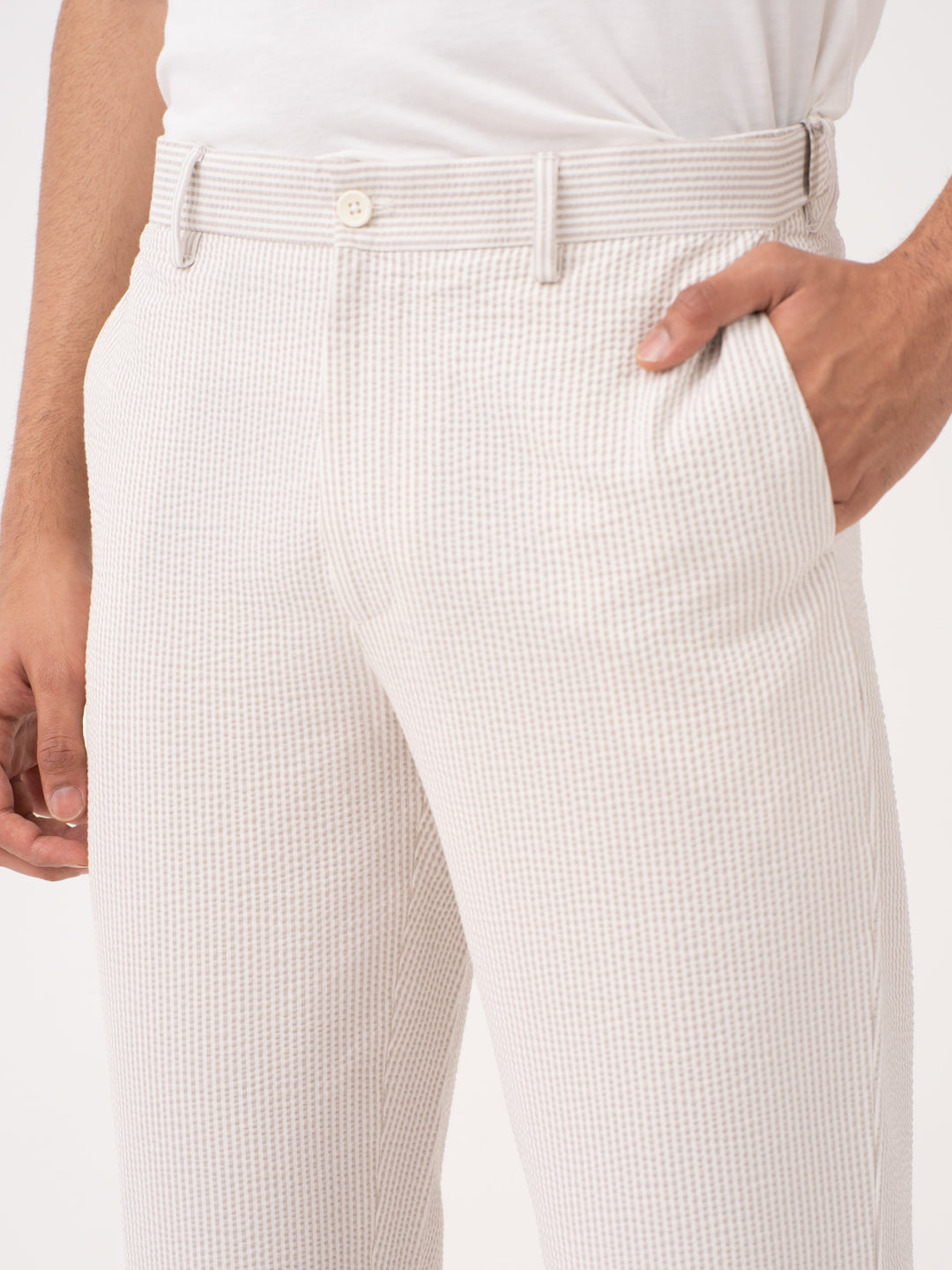 For those who crave effortless style, the Terrain Taupe Stripes Seersucker Pants is your go-to. Designed with a unique puckered texture, these pants offer superior breathability and comfort during warm weather. The Terrain Taupe stretchable seersucker trousers are crafted with stretch to ensure freedom of movement, while the moisture-wicking fabric keeps you feeling fresh throughout the day. With wrinkle-resistant properties, these pants maintain a crisp, polished look, no matter how busy your day gets. Perfect for casual outings or dressier moments, these versatile pants combine the best of fashion and function. Stay cool, stay stylish, and stay ready for anything.