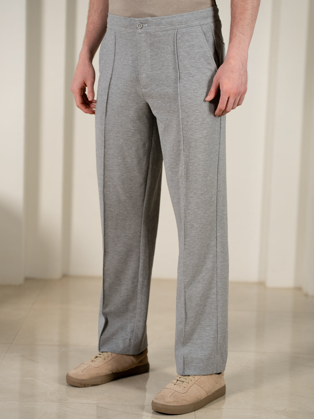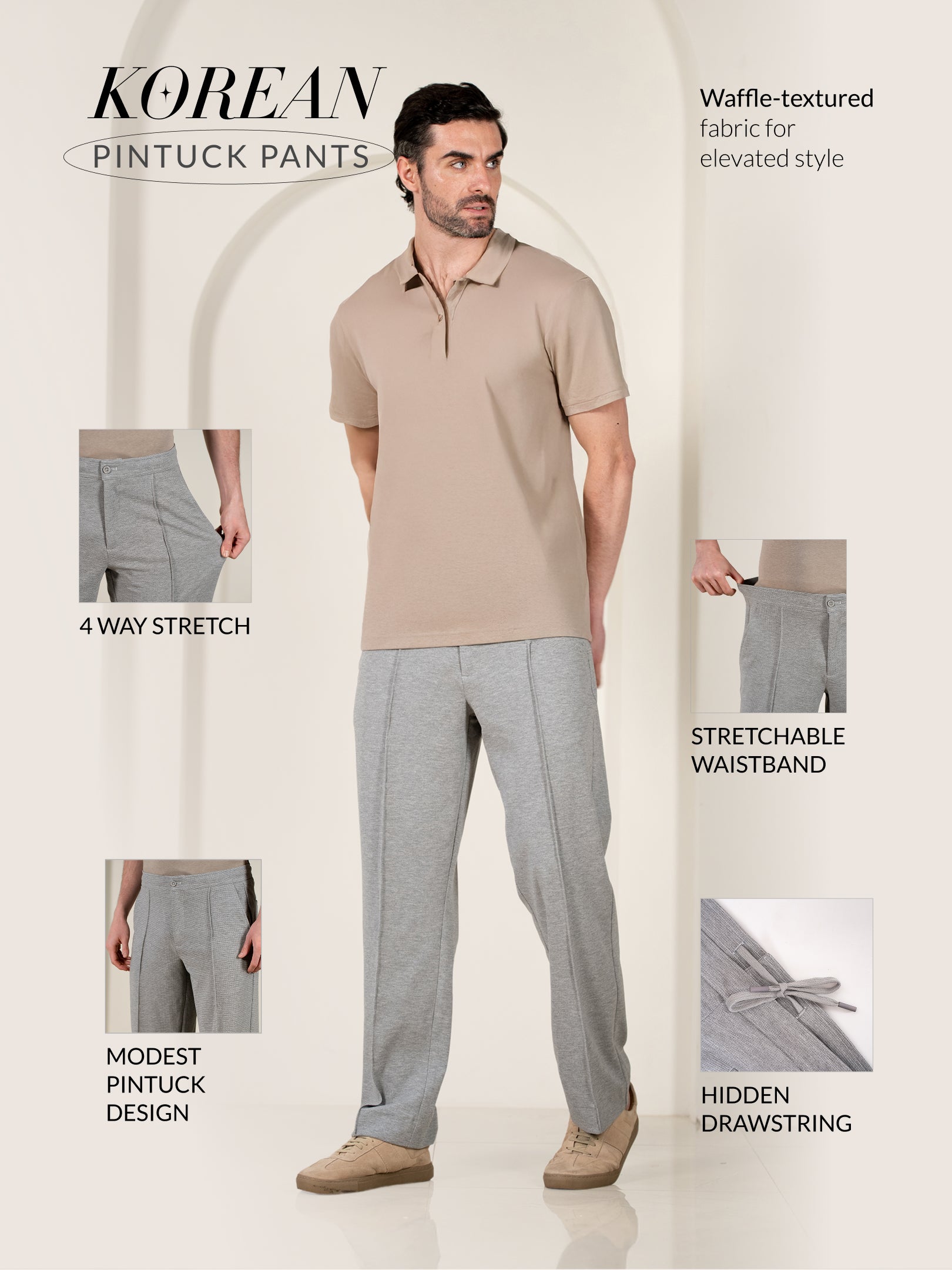 These Tharn Grey Korean pintuck pants are your secret weapon—sleek, effortless, and always in control. The relaxed fit keeps you comfortable, while the sharp pintucks add a touch of structure. Crafted with 4-way stretch fabric, they move as smoothly as your best one-liner. Plus, the wrinkle-resistant, lightweight, and moisture-wicking design keeps them looking fresh all day. Whether you’re making a power move at work or a casual flex at dinner, these black relaxed fit korean pintuck pants for men ensure you stay sharp without breaking a sweat.